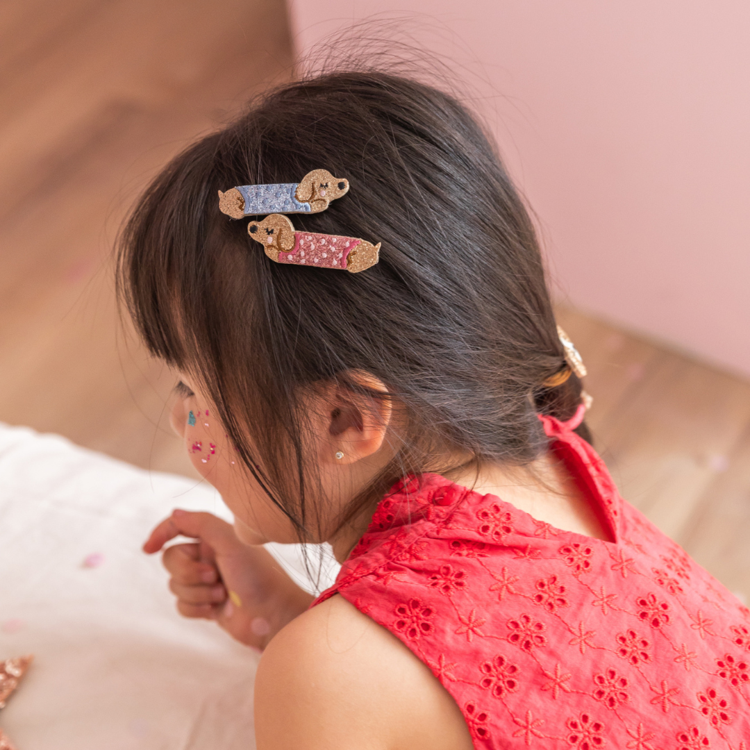 A Luciole et Petit Pois hajcsat - tacskó két aranyos kutyust ábrázol csillogó pulcsiban. Ezek a kedves hajcsatok játékosan díszítik a frizurát, és stílusos kiegészítők lehetnek a mindennapokban vagy akár egy különleges alkalomhoz is.