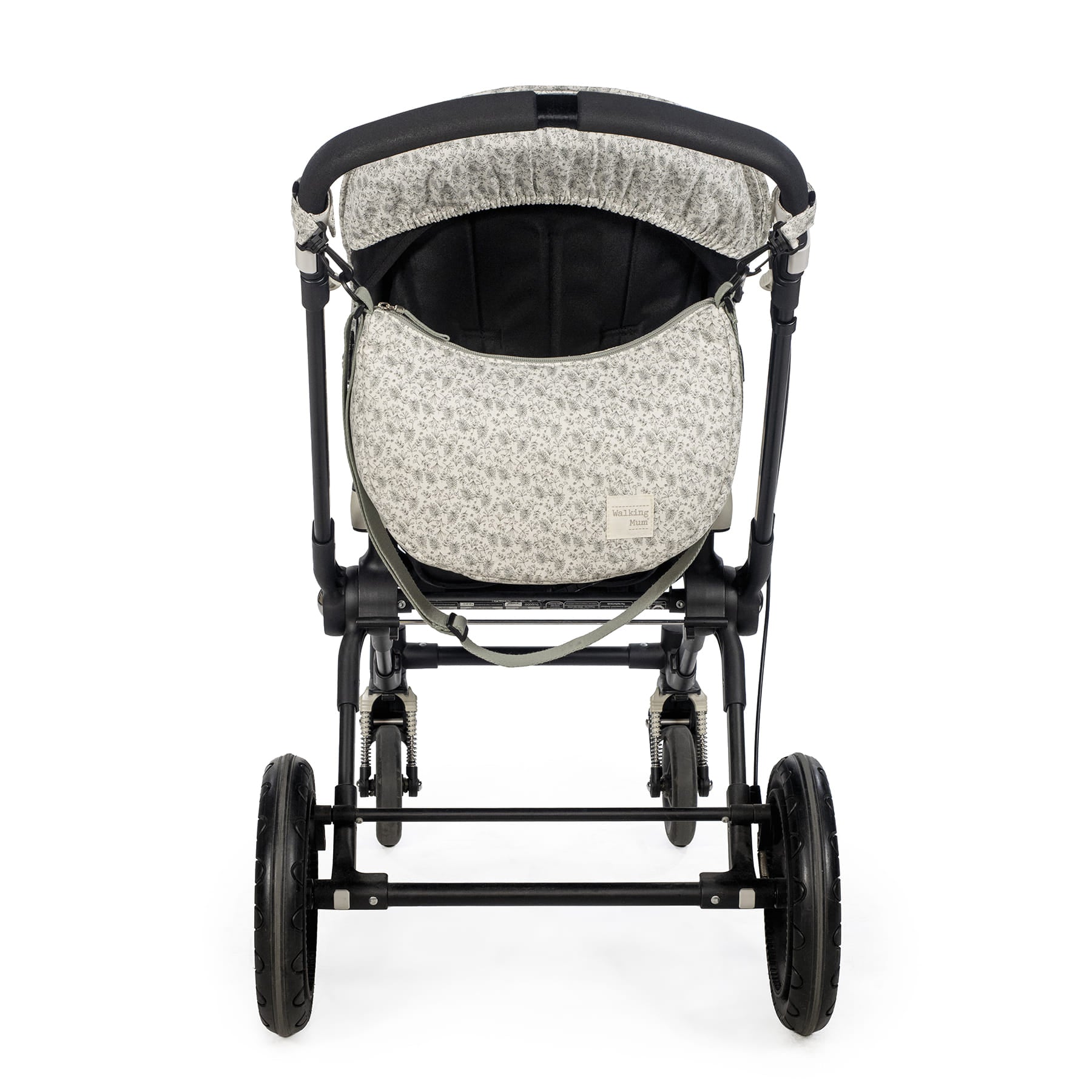 Modern, multifunkcionális babakocsira rögzíthető gondola pelenkázó táska menta színben, kifinomult, virágos mintával.