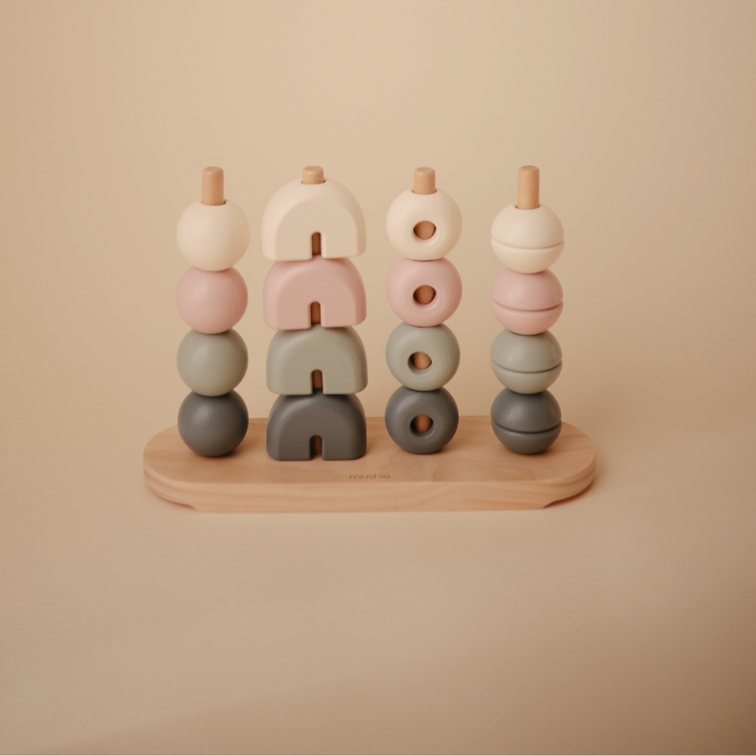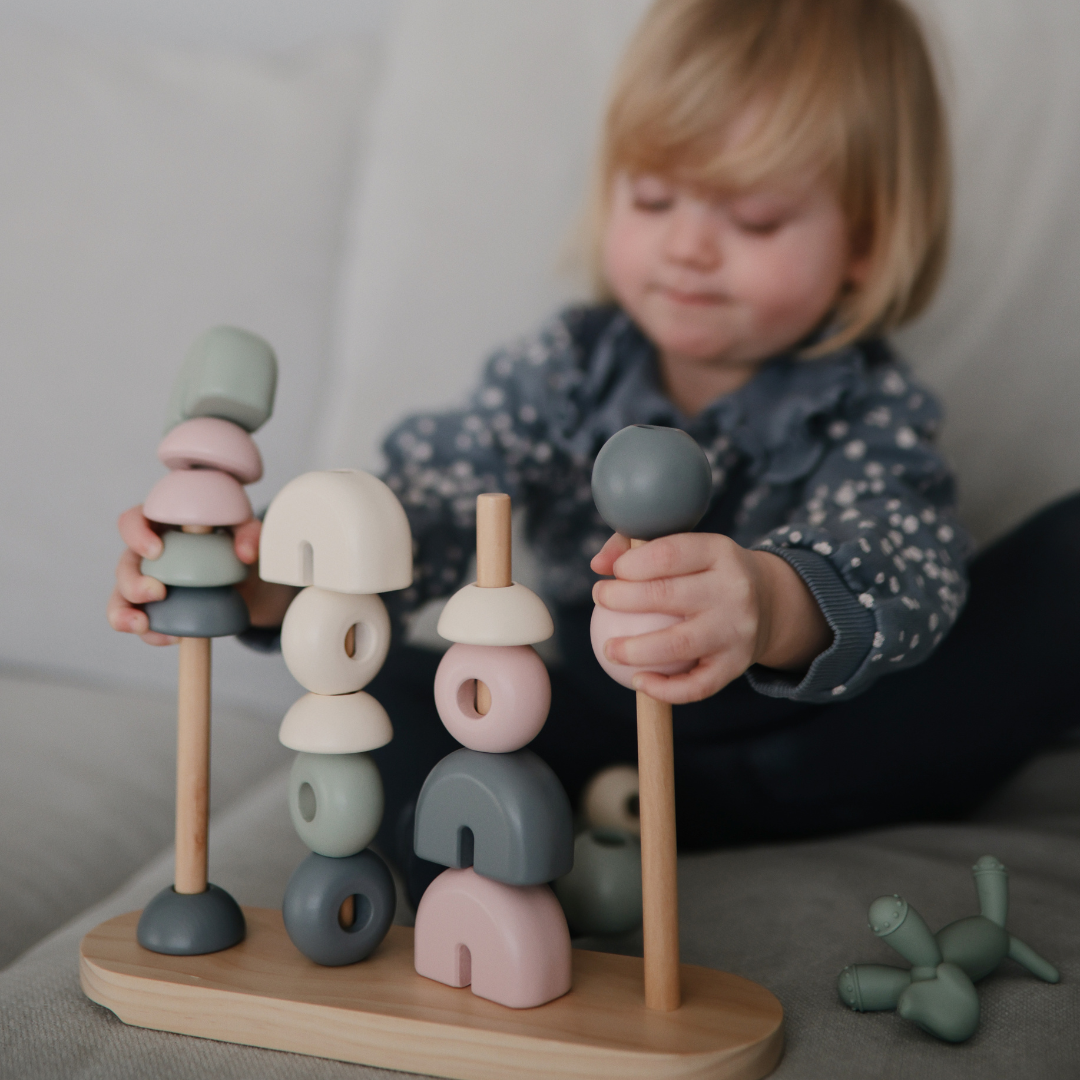 Időtlen, készségfejlesztő játék, amely szórakoztató módon segíti a tanulást. A 20 darab pasztell színű fa forma apró kezekhez tervezett, így ideális a színek, formák és térbeli gondolkodás megismeréséhez.