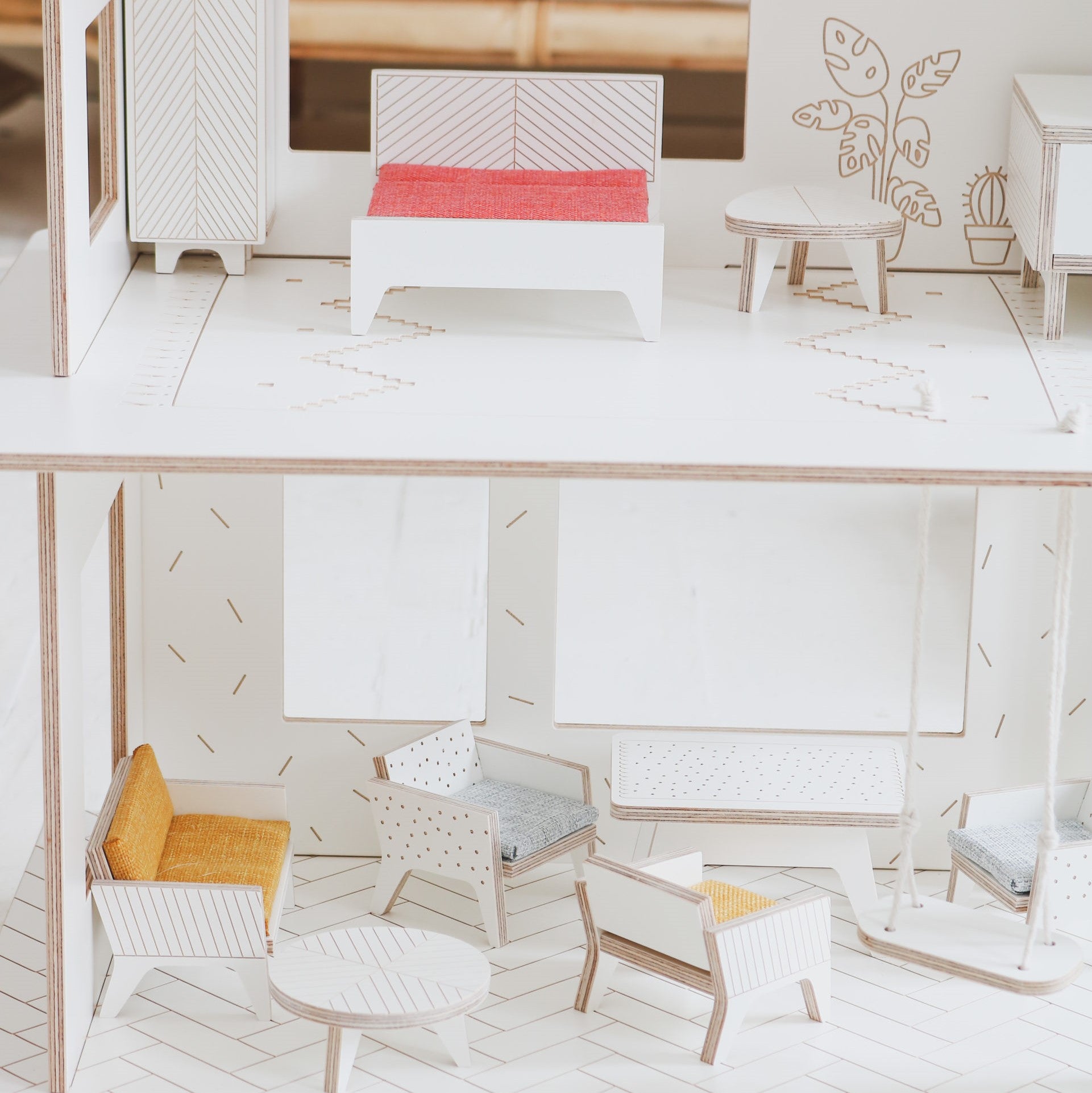 Egy mesebeli babaház saját hintával, gravírozott díszítéssel.