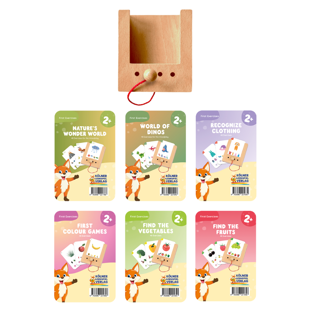 - 6 db kártyacsomag (1 csomagban 24 kártya, összesen 48 kétoldalas feladat): Természet, Dínók, Öltözködés, Színek, Zöldségek, Gyümölcsök
