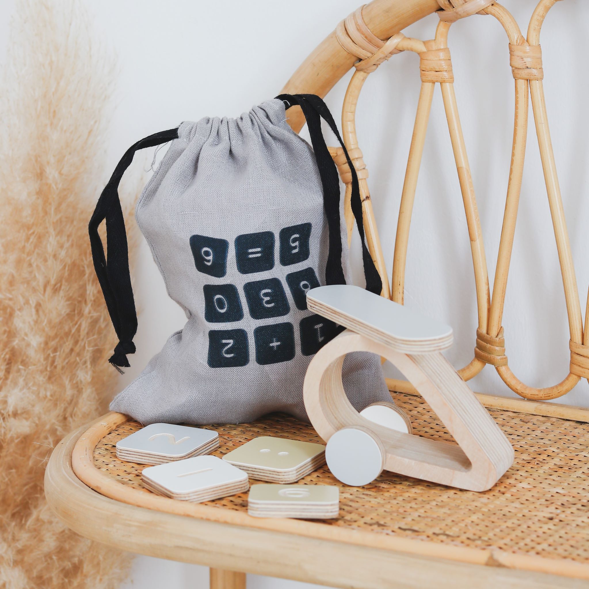 A fából készült játék 48 darab fa kockából és 1 kézzel nyomott, pamut tasakból áll.