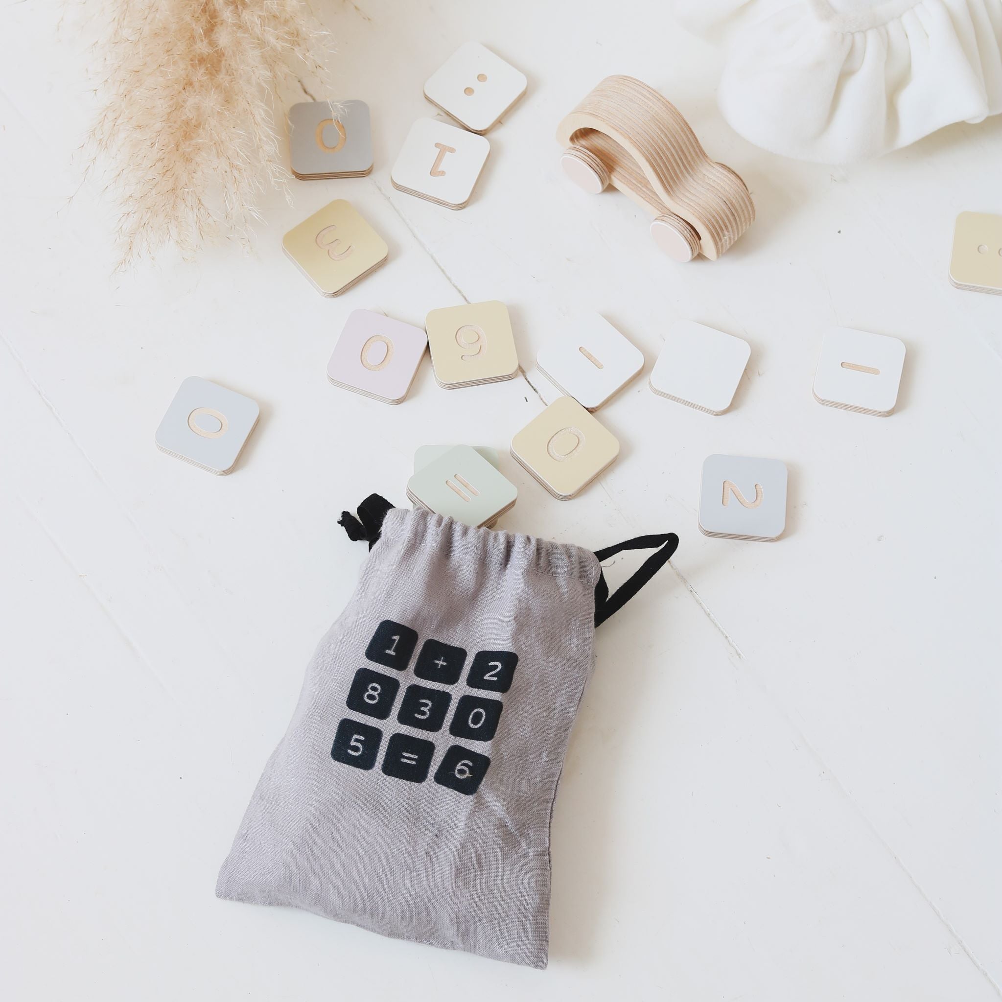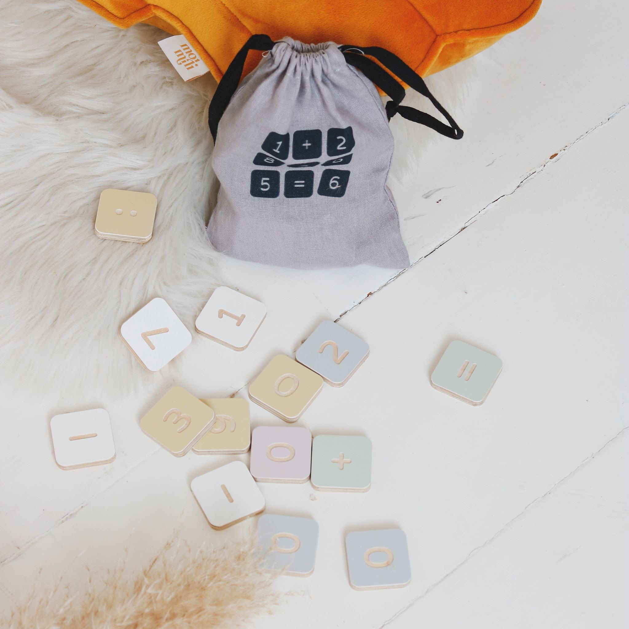 A Színes matematika fejlesztő játék fakockákból áll, amiken 0 és 9 közötti számok, valamint műveletjelek találhatók.