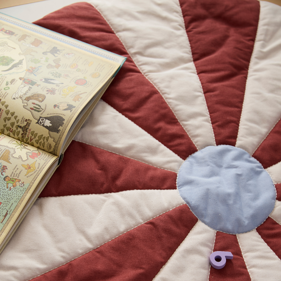A steppelt szőnyeg újrahasznosított poliészter töltettel készült, külső rétege pedig puha tapintású pamut. Az egyik oldala csíkos - ez a klasszikus cirkuszi világot idézi, míg a másik oldal letisztult, törtfehér színű, így könnyedén igazítható a hangulathoz.