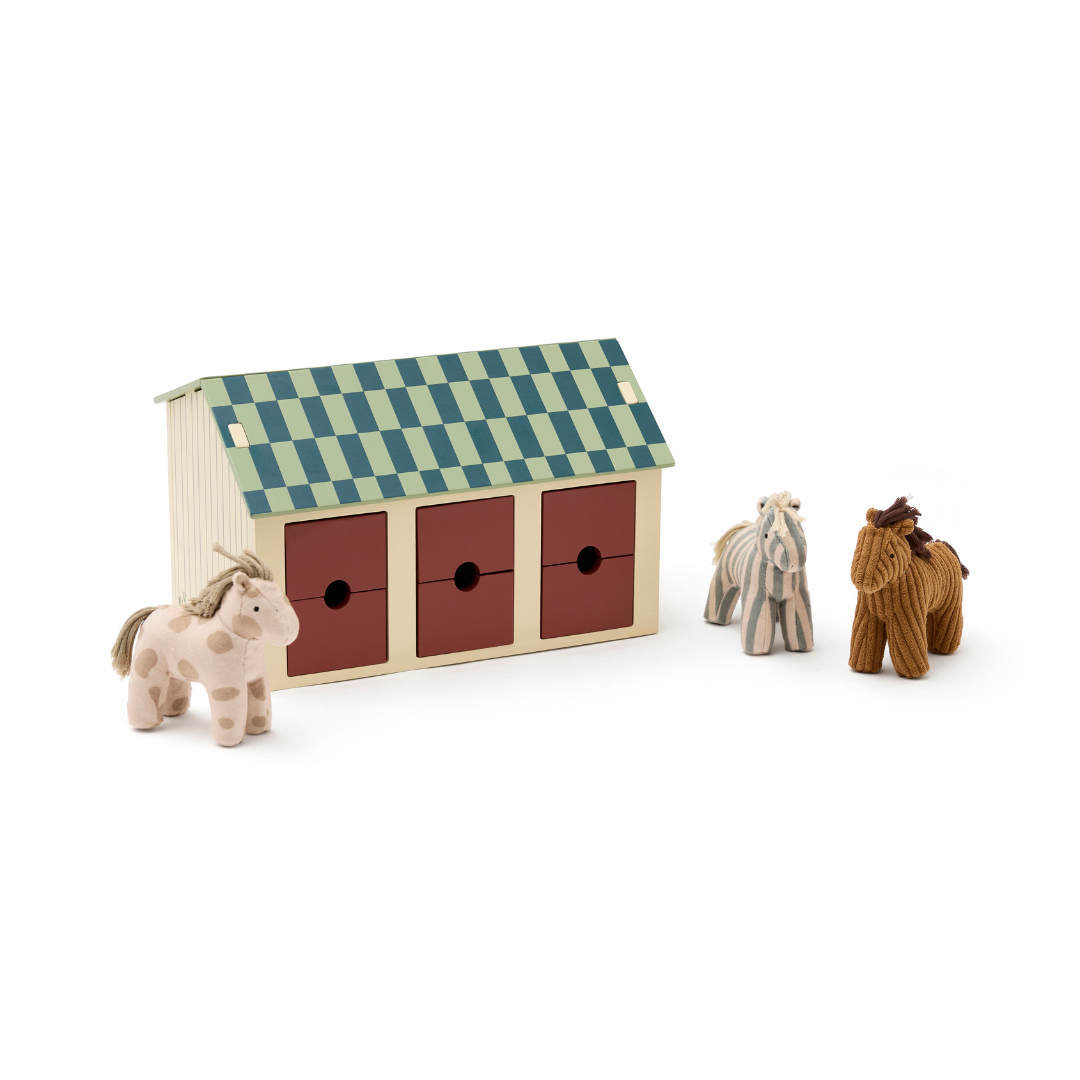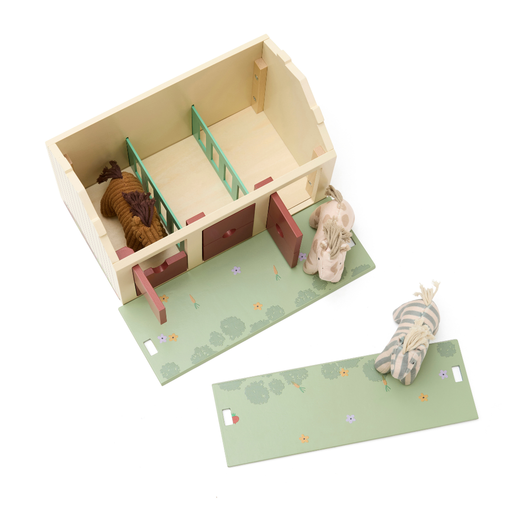 Sam, Dotty és Vera saját istállójukban várják a játékot. A fa istálló három különálló boxot tartalmaz, osztott ajtókkal, akárcsak egy igazi lovardában: a gyerekek kinyithatják csak a felső részt, az alsót, vagy akár az egész ajtót is.