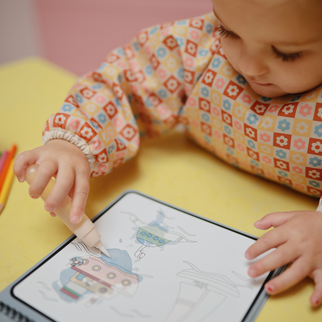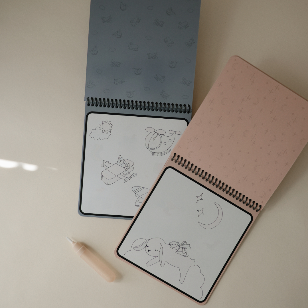 Indítsd be a kicsik fantáziáját a Mushie újrahasználható vízzel színező és festhető füzettel! A négy oldalas füzet elbűvölő, mesebeli jeleneteket rejt, amelyek vízzel „kifestve” kelnek életre festék és rendetlenség nélkül.