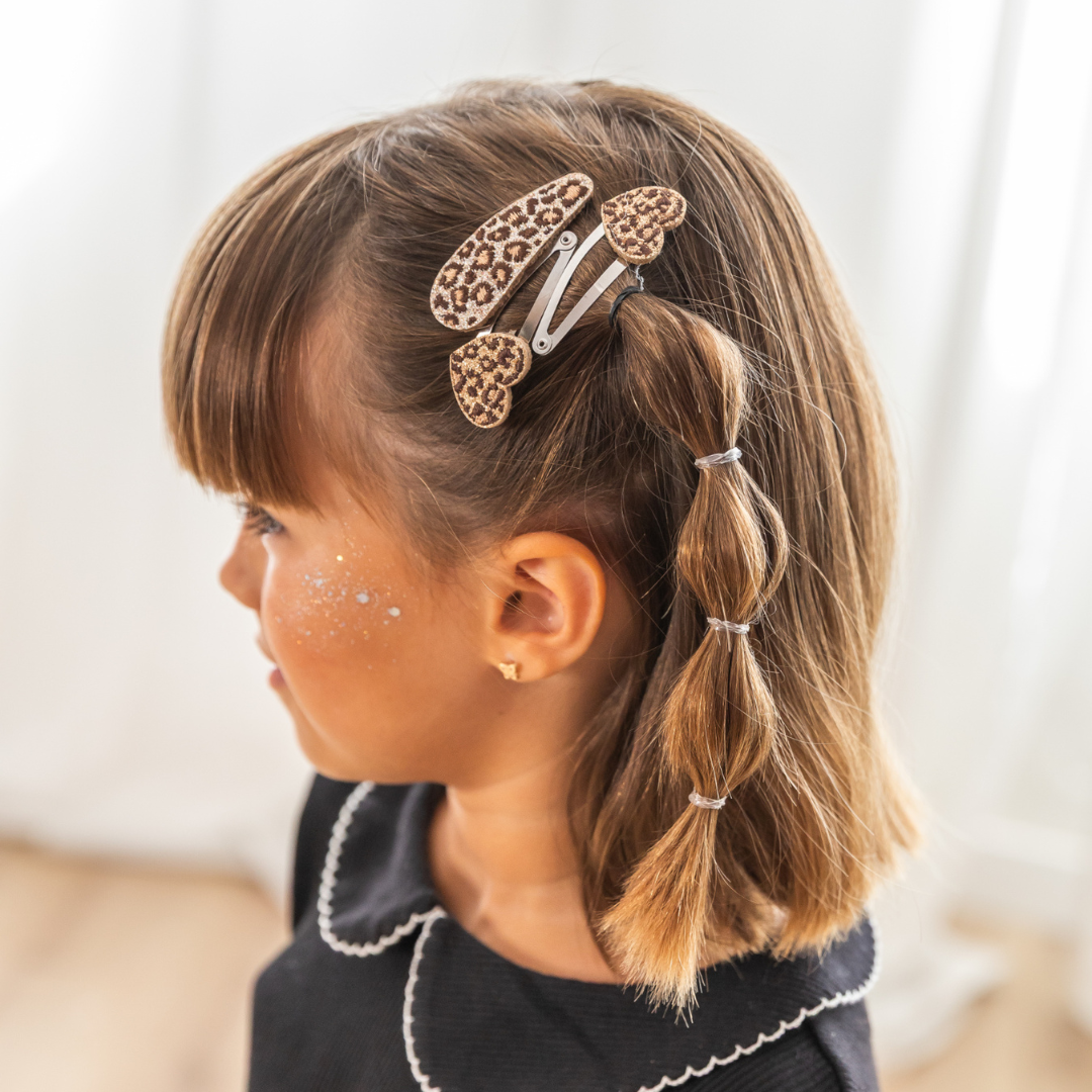 A Luciole et Petit Pois hajcsat – leopárd mintás szív játékos és stílusos kiegészítő minden kis divatrajongónak. A kb. 2 × 2 cm-es szív alakú díszek különleges, leopárdmintás textillel készülnek, így vadóc, mégis bájos hangulatot adnak a frizurának.