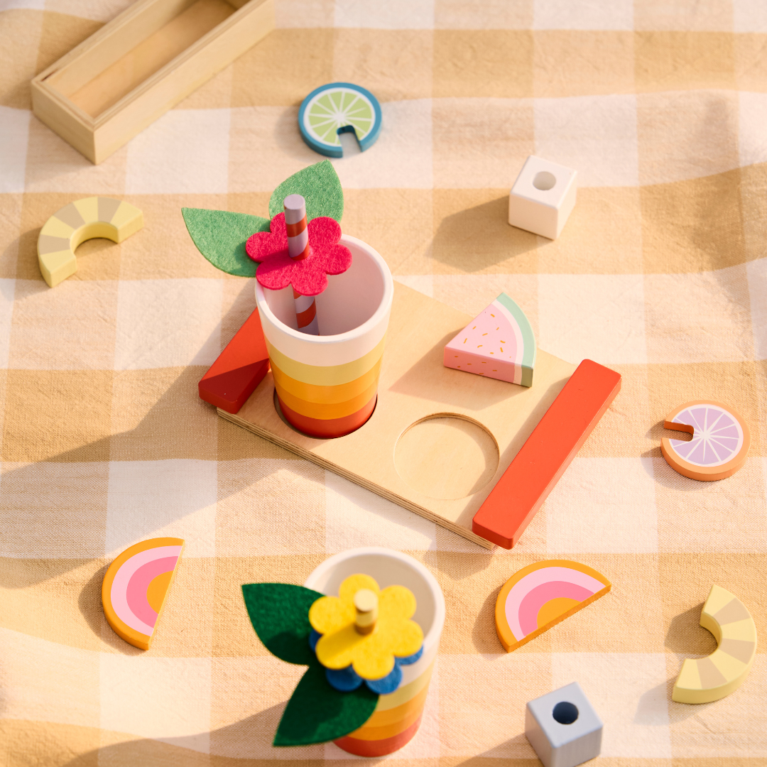 A Kid's Concept nyári koktél készlettel a gyerekek igazi kis mixermesterekké válhatnak. Keverhetnek színes, fa gyümölcsitalokat, díszíthetnek filc dekorációkkal, és tálalhatnak jégkockákkal, pont úgy, mint egy igazi nyári buliban.
