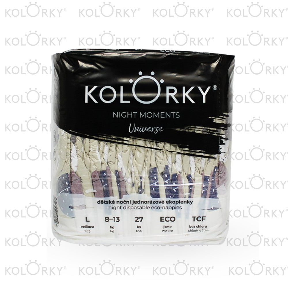 A pelenka jól illeszkedik a baba formáihoz, kiváló nedvszívó képességekkel rendelkezik, légáteresztő. Vastagabb nedvszívó réteggel rendelkezik, mint a Kolorky Day öko pelenkák, így biztosan "kibírja" az estét. Puha anyagának köszönhetően könnyed viselet. A Kolorky pelenka nem tartalmaz klórt, káros műanyagokat, kőolajszármazékot, latex- és parfümmentes. Összetételnek köszönhetően ideális az érzékenyebb bőrű babák számára is.