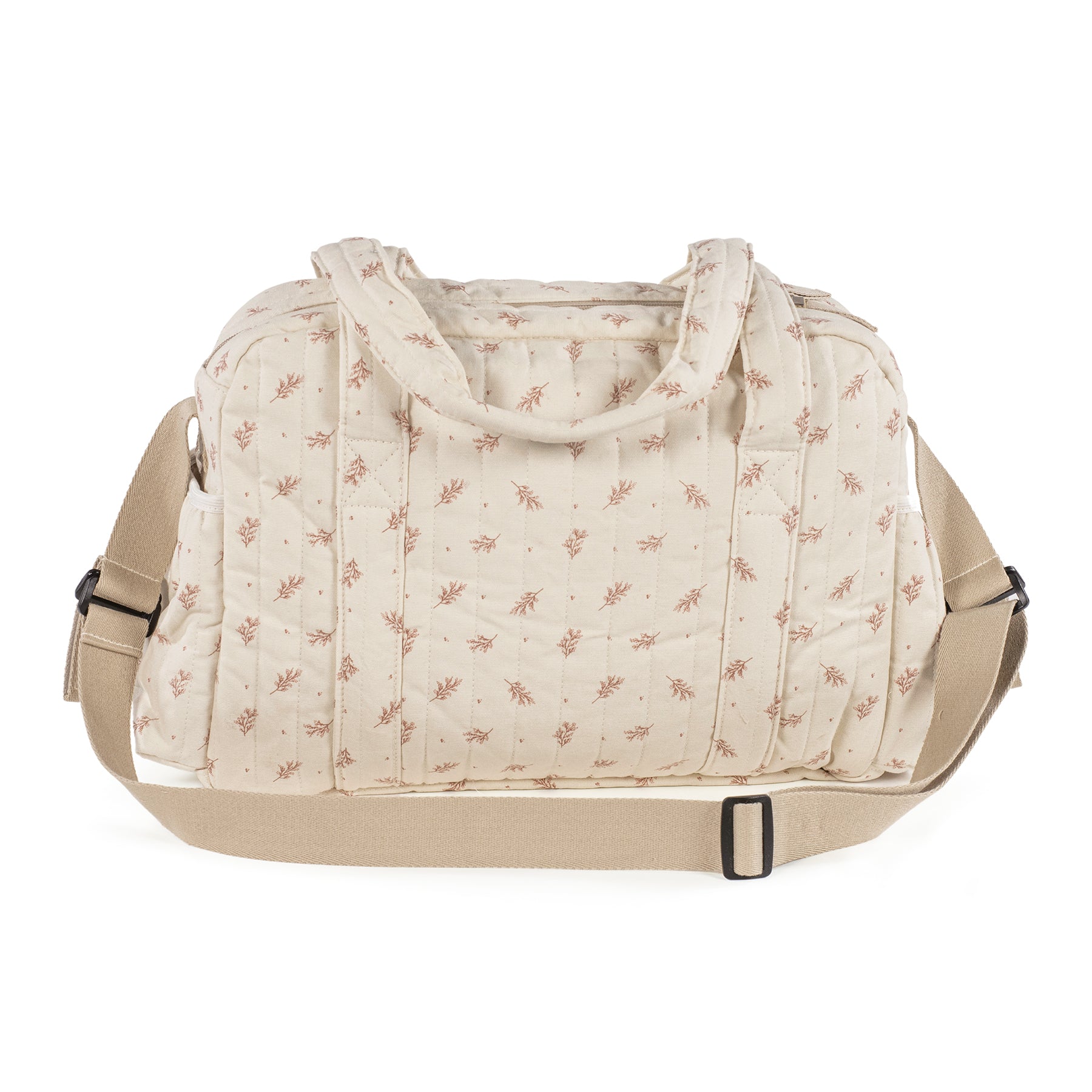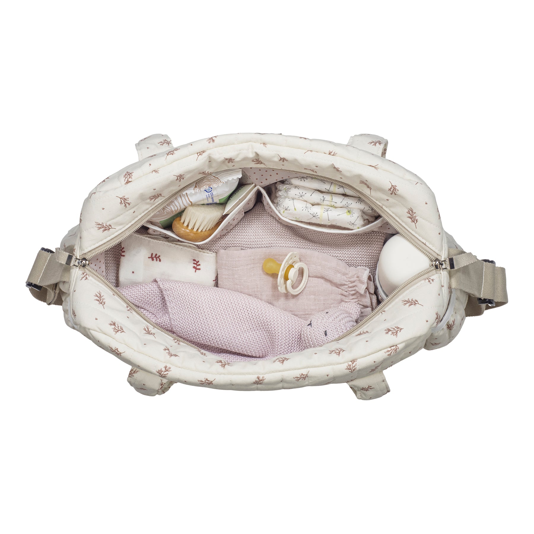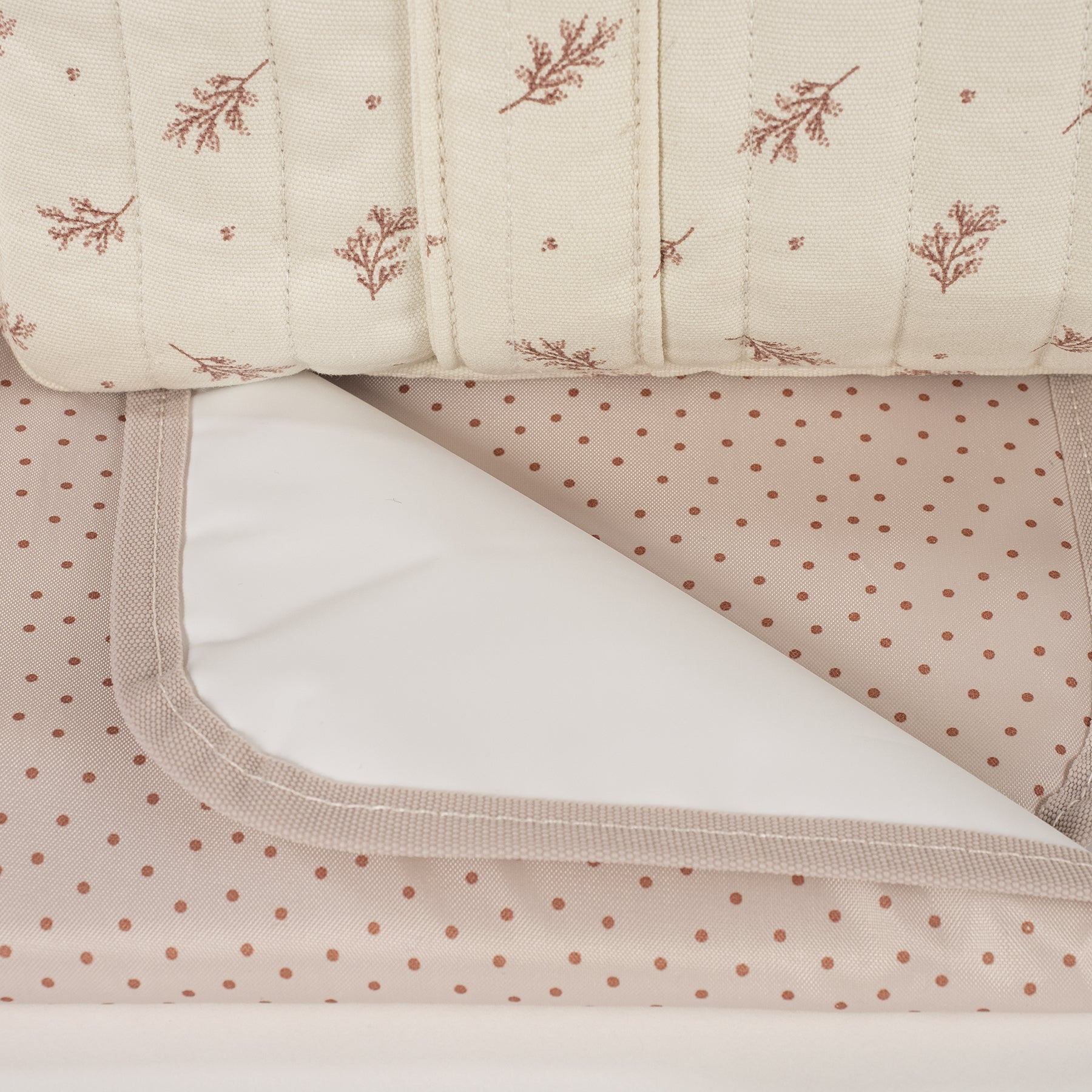 Modern, multifunkcionális pelenkázó táska bézs alapon rózsaszín mimóza virágokkal és hozzá illő pelenkázó lappal.