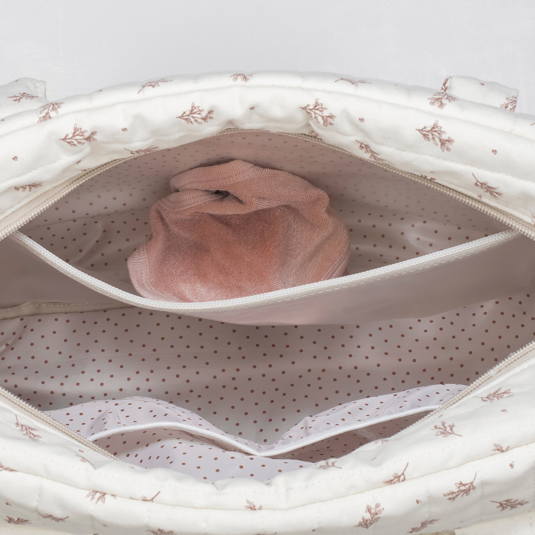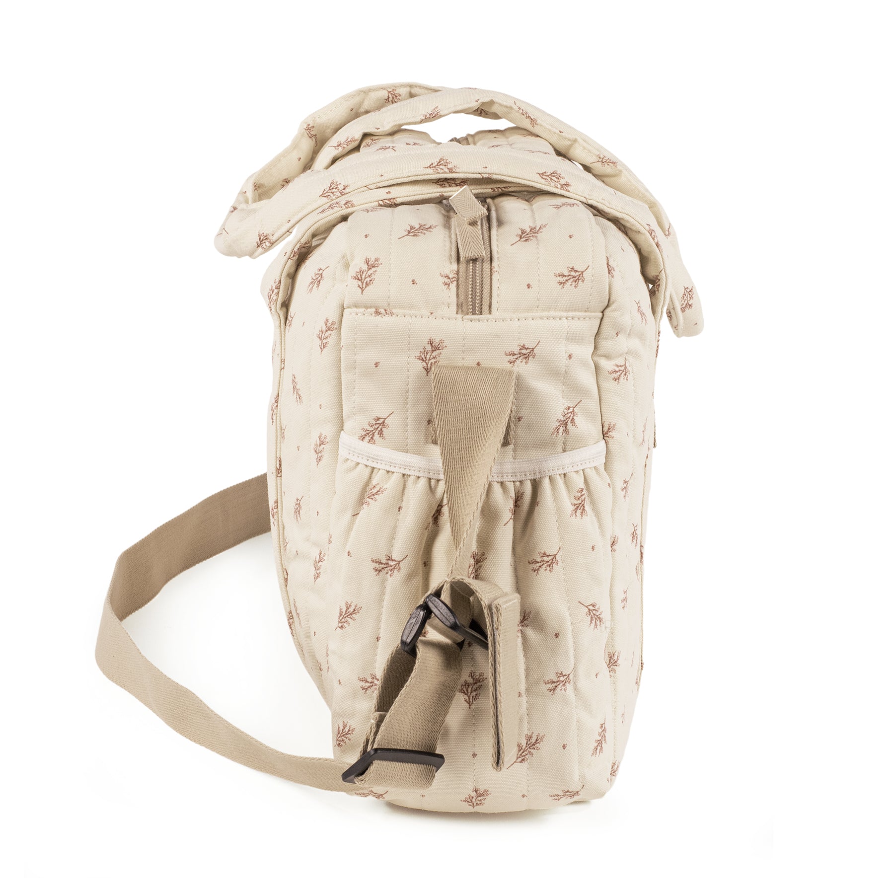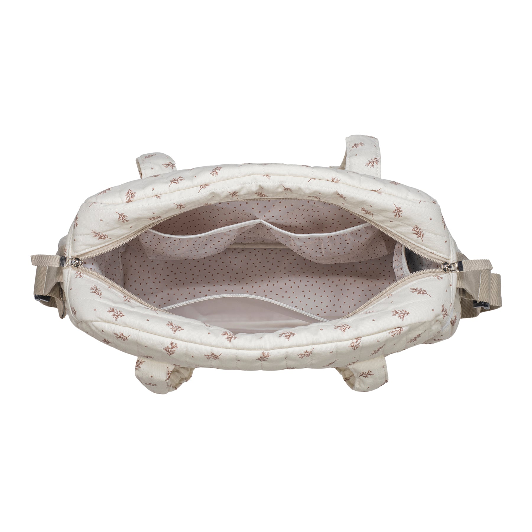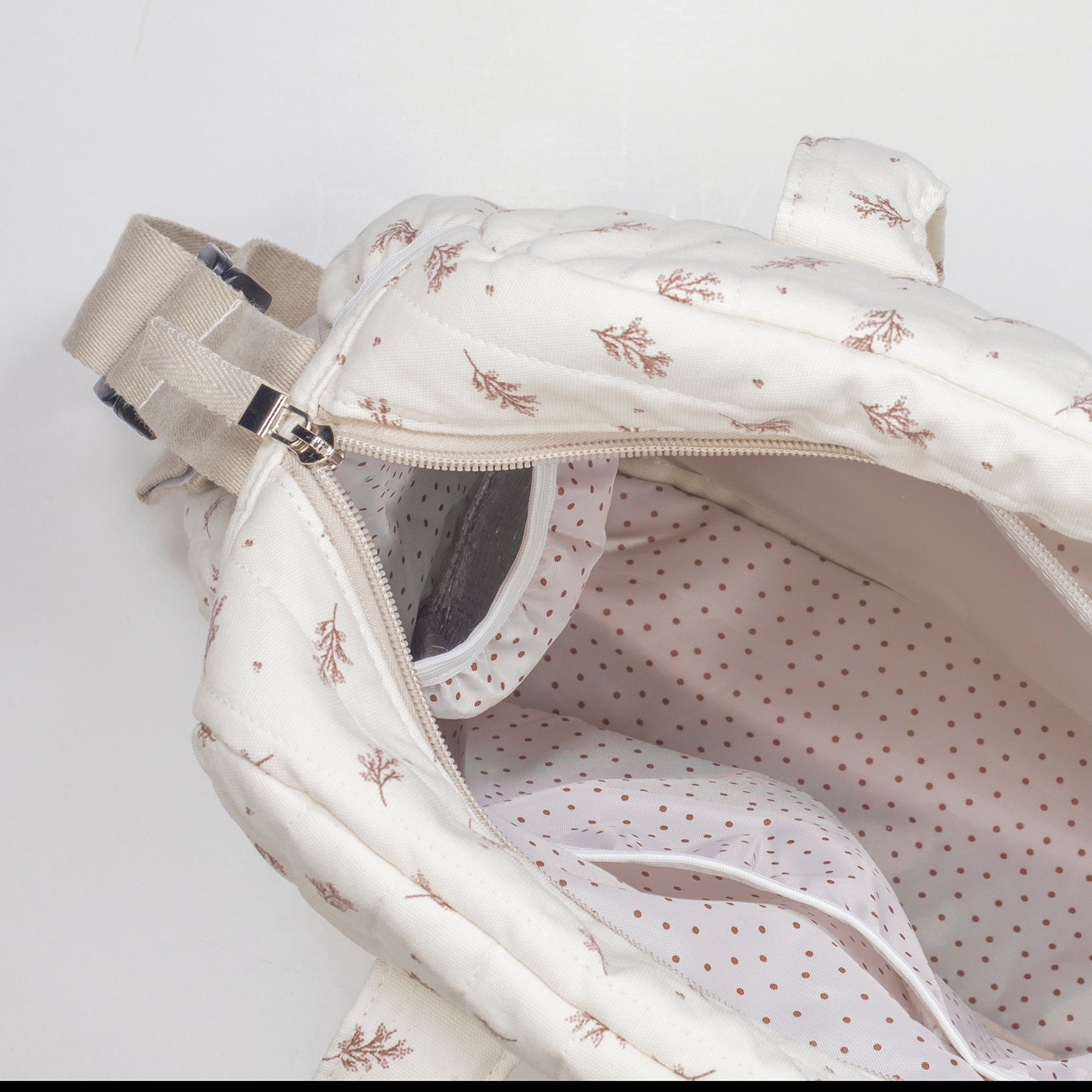 Modern, multifunkcionális pelenkázó táska bézs alapon rózsaszín mimóza virágokkal és hozzá illő pelenkázó lappal.