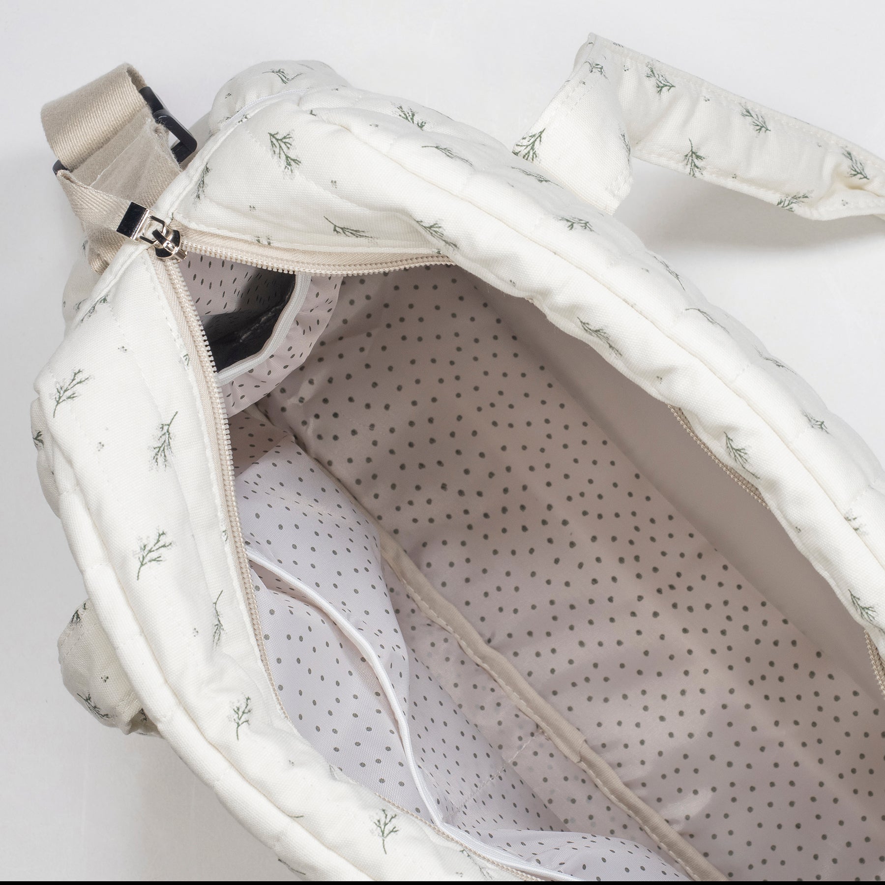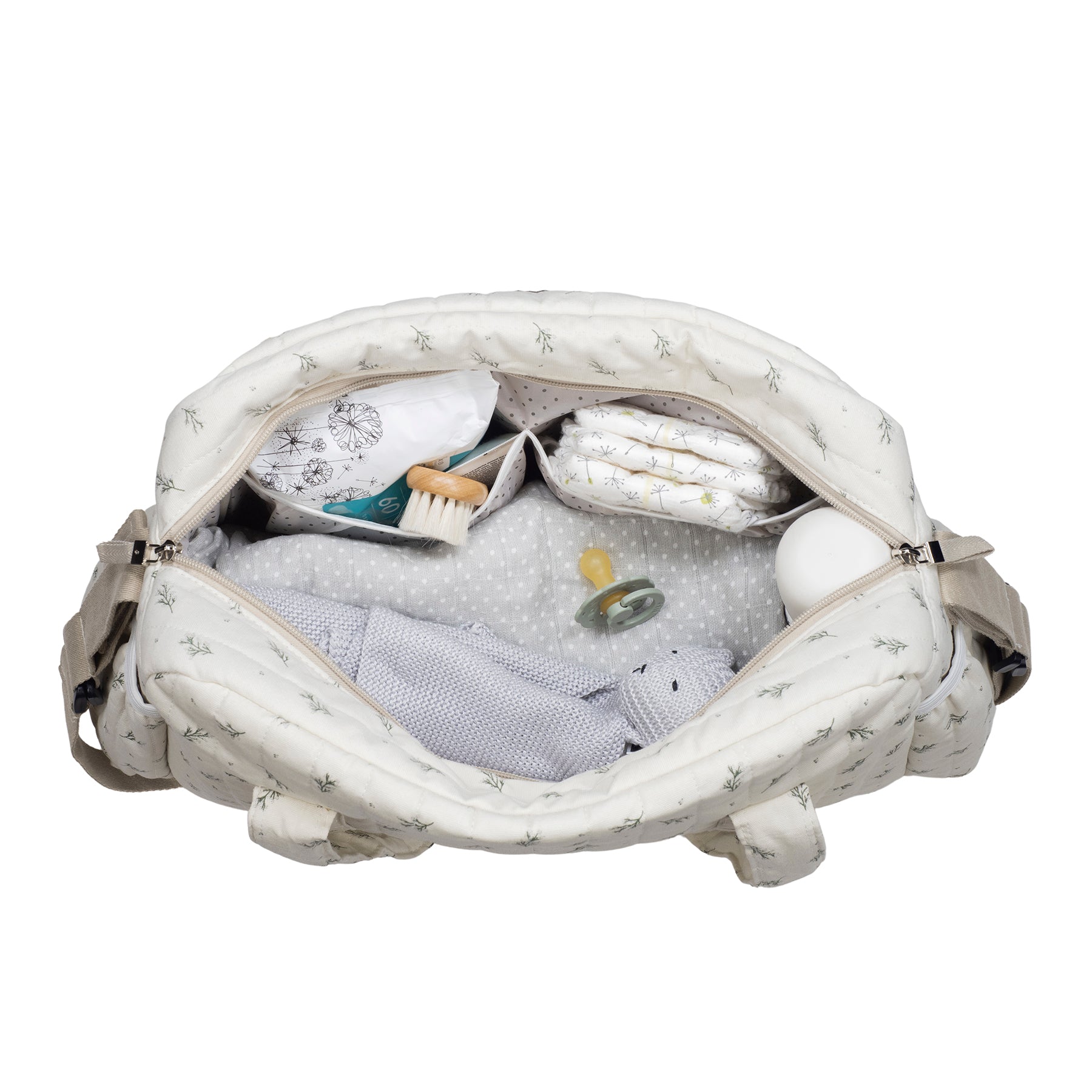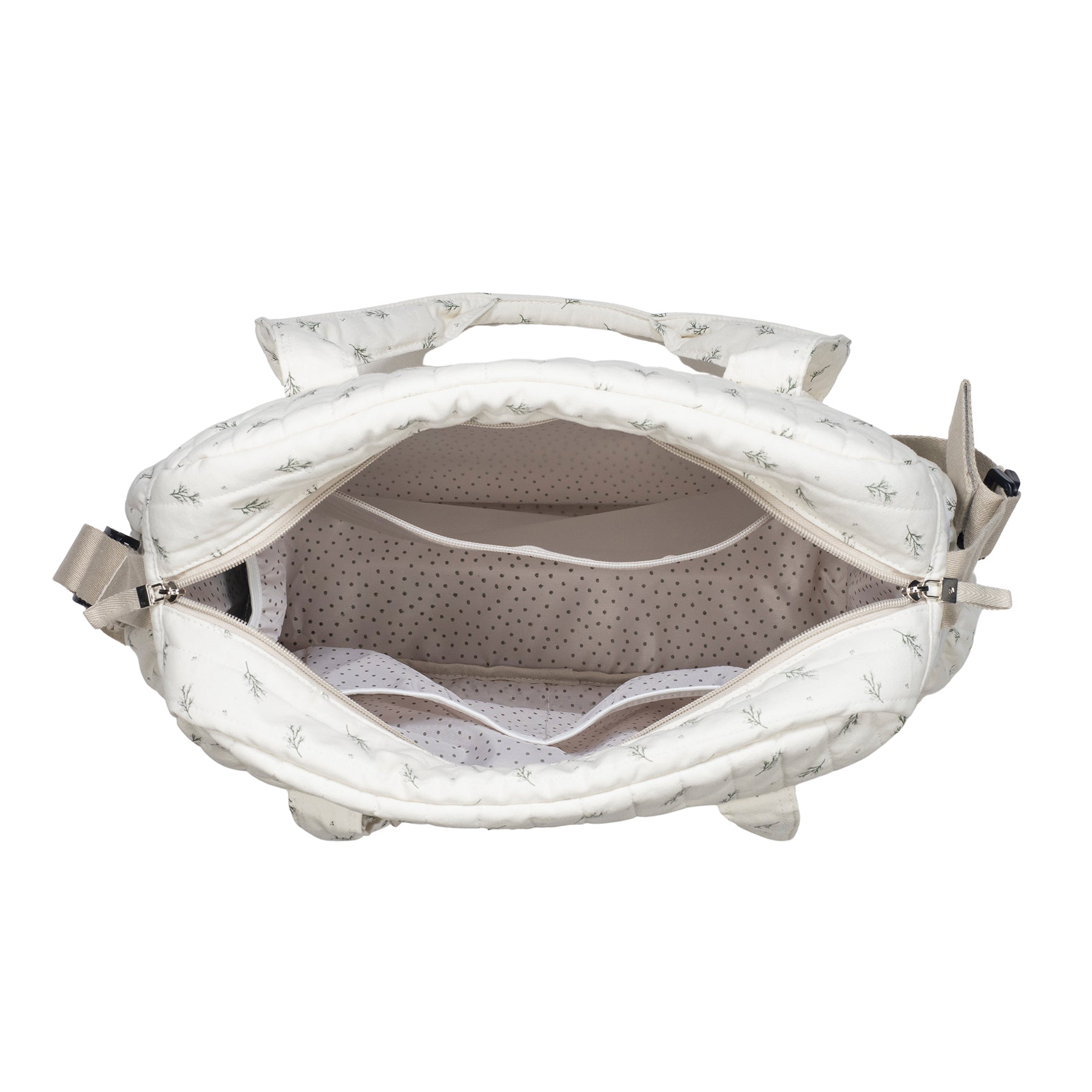 Modern, multifunkcionális pelenkázó táska bézs alapon zöld mimóza virágokkal és hozzá illő pelenkázó lappal.