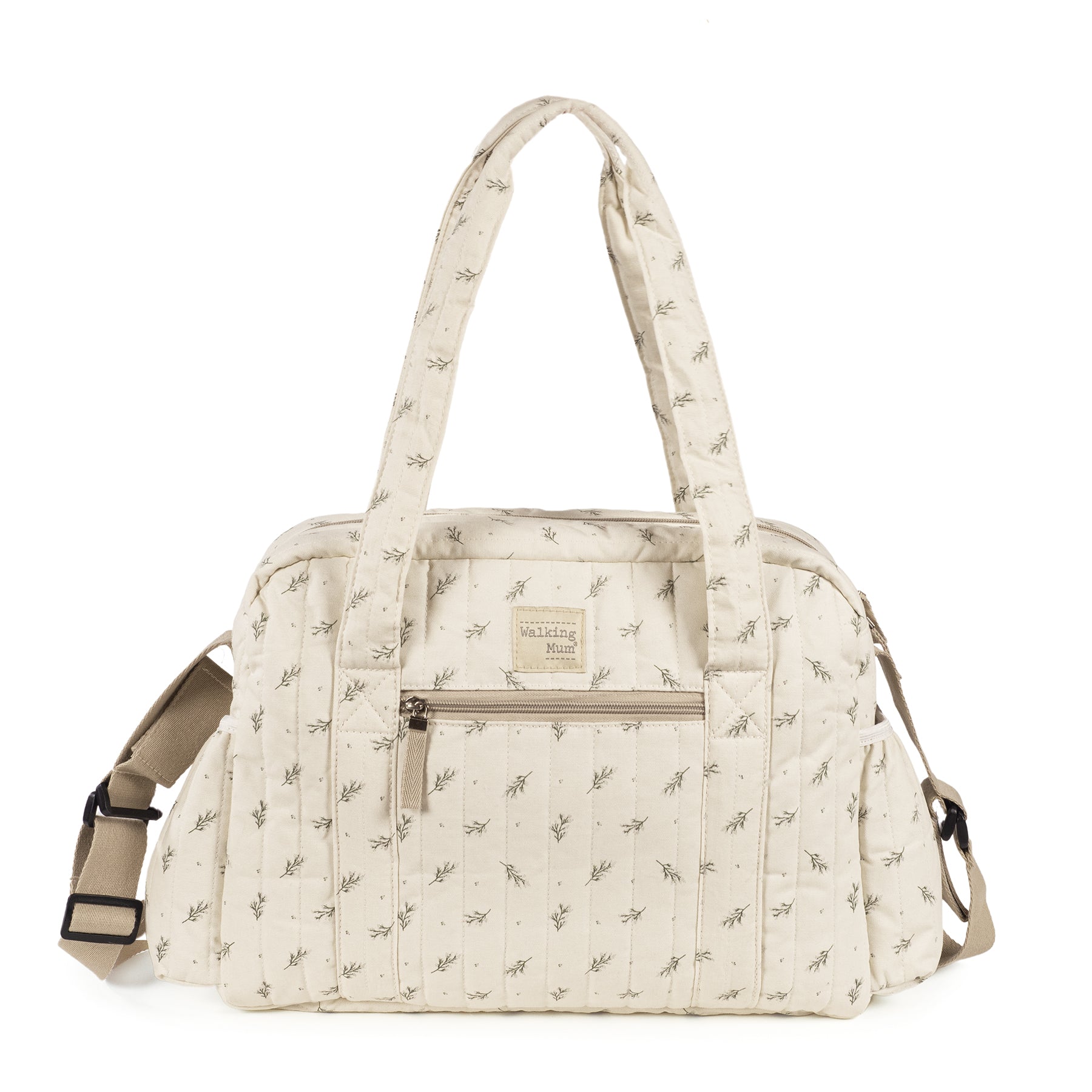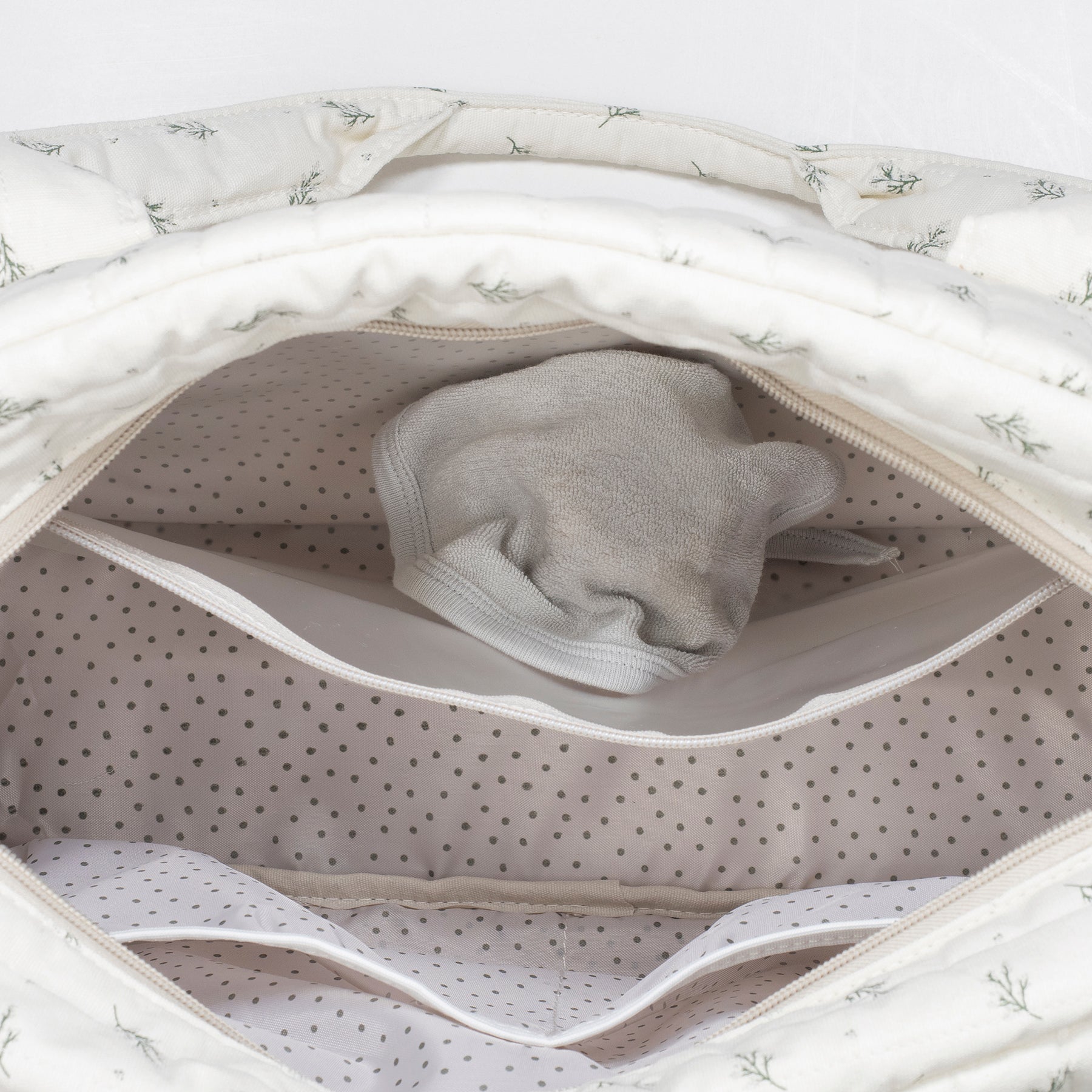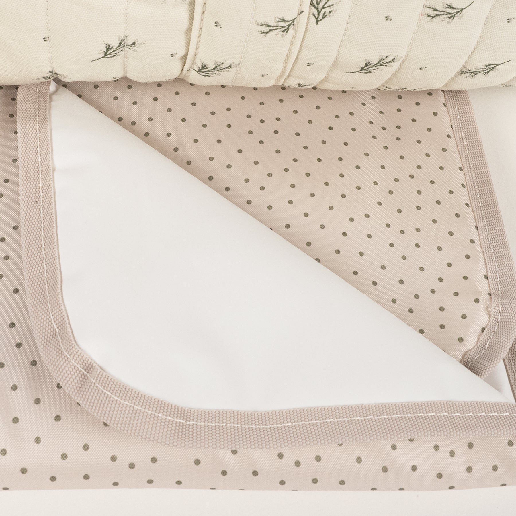 Modern, multifunkcionális pelenkázó táska bézs alapon zöld mimóza virágokkal és hozzá illő pelenkázó lappal.