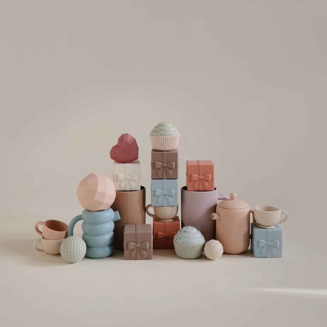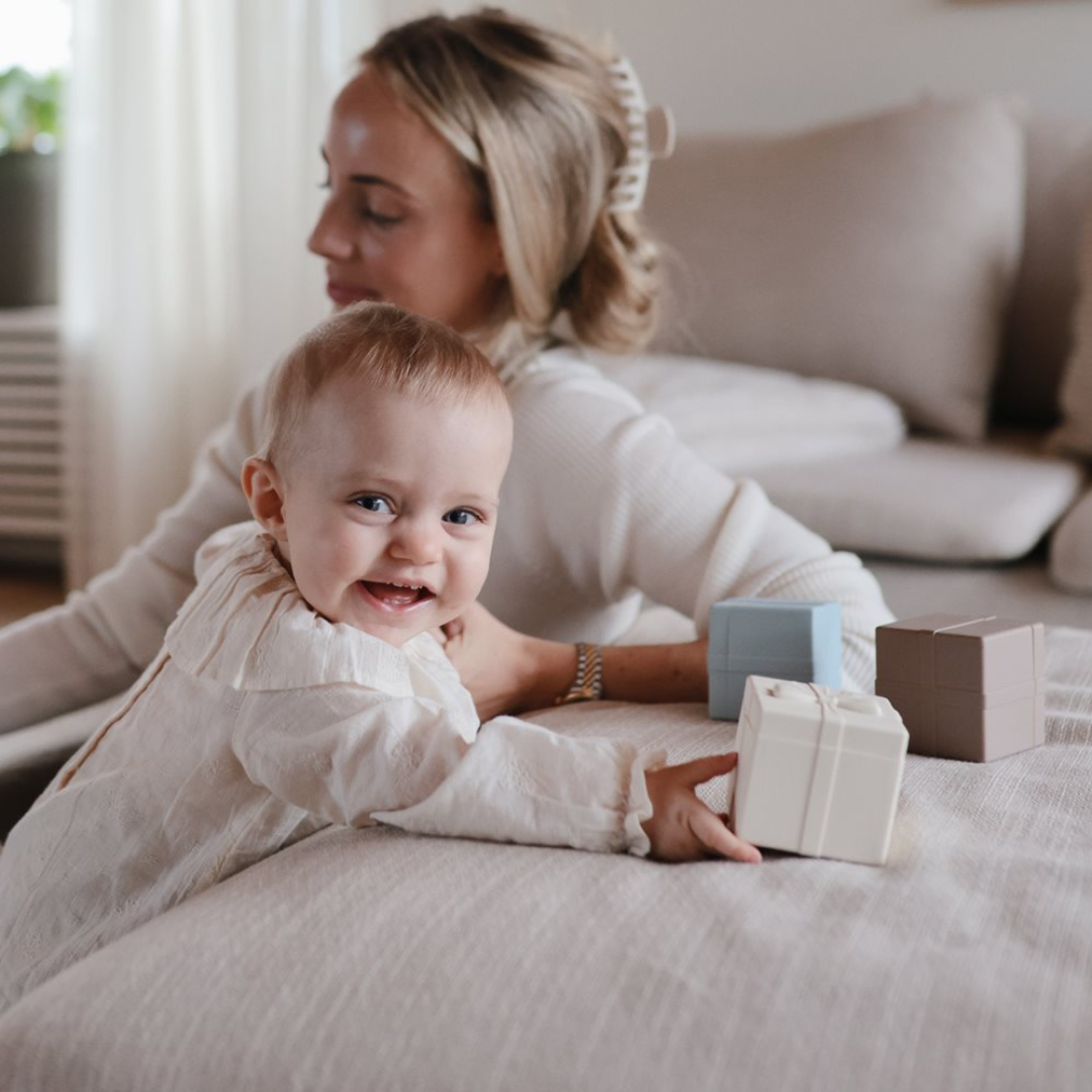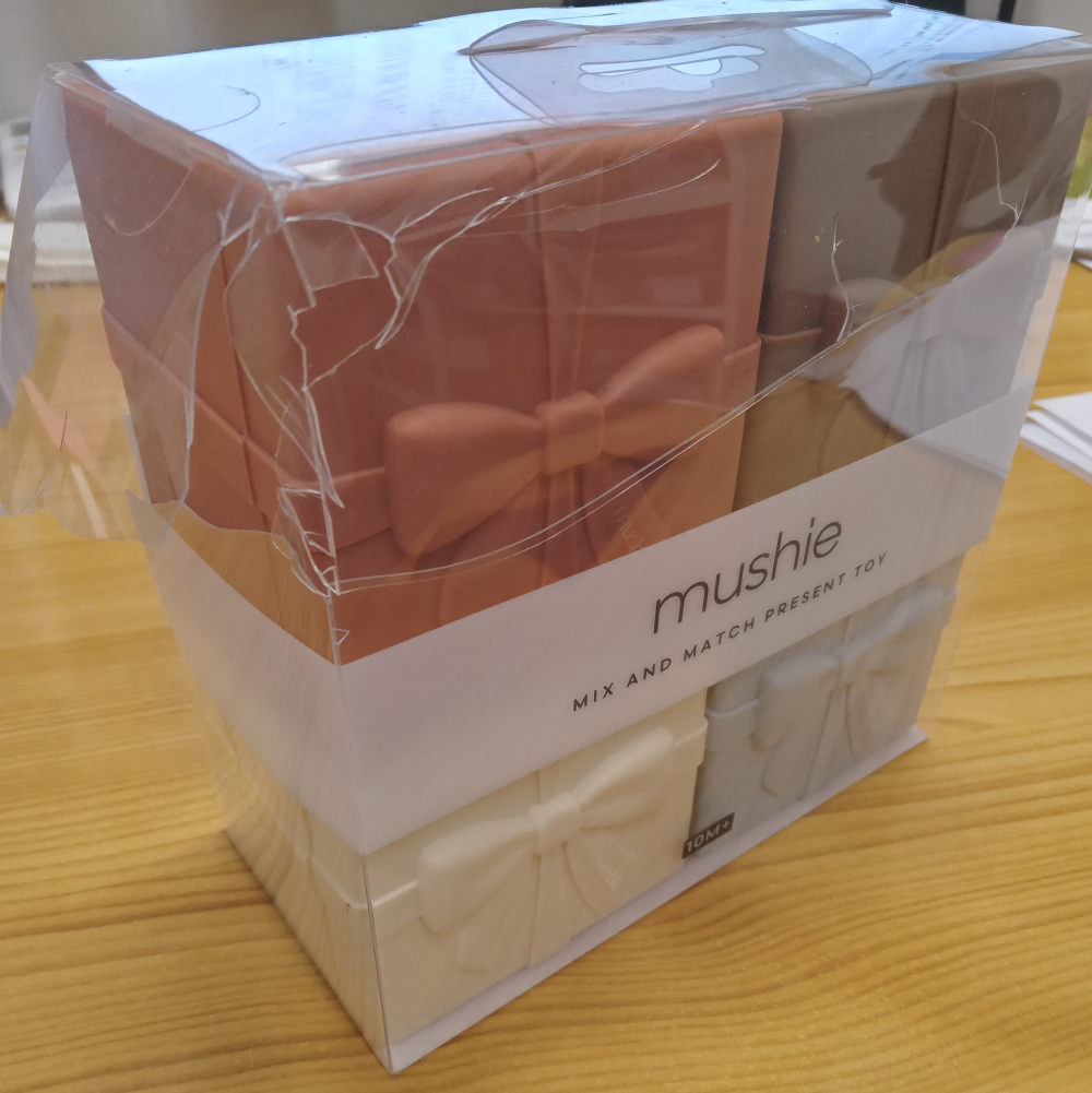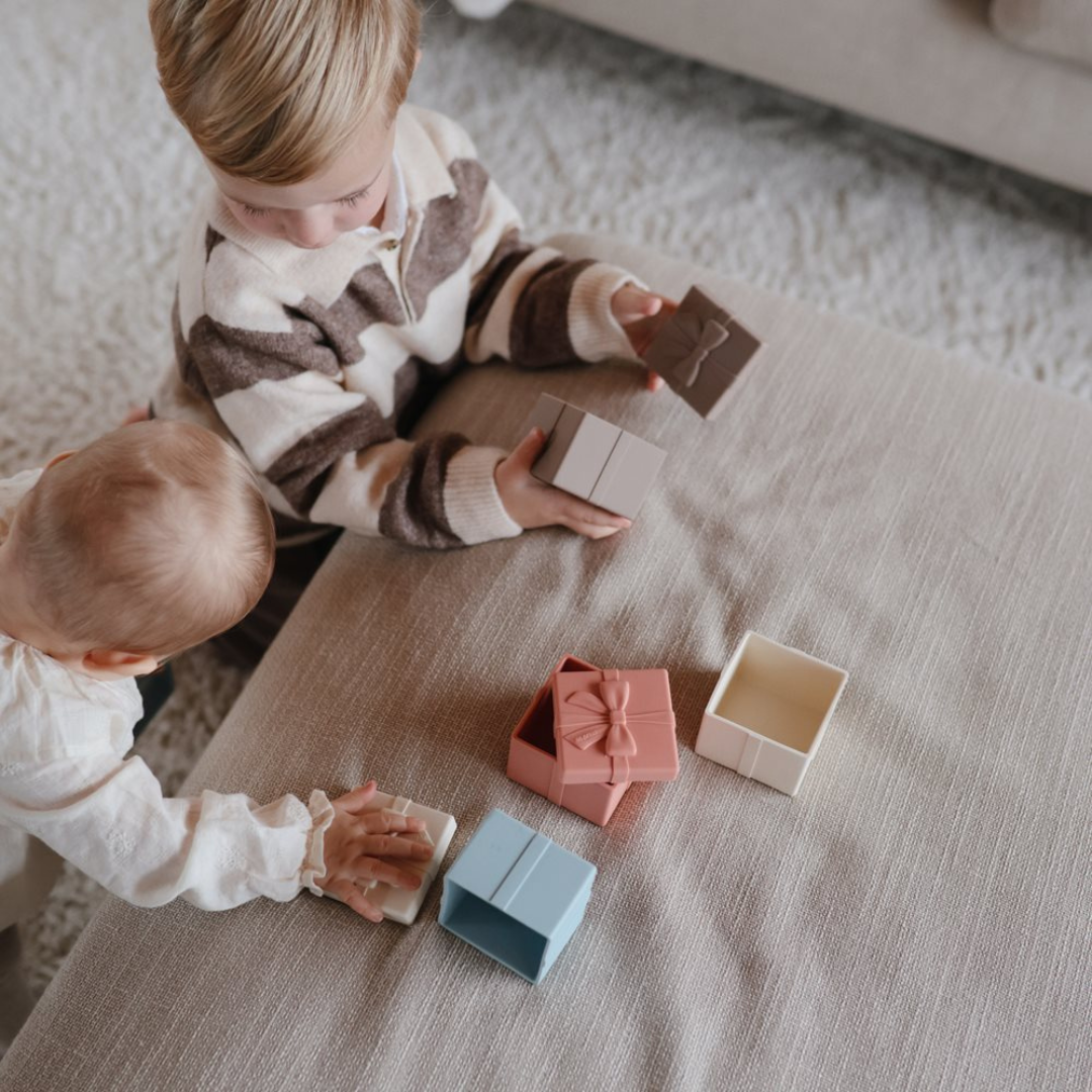 A Mushie ajándék formájú szilikon fürdőjáték vidám kiegészítője a pancsolásnak és a játékidőnek. A biztonságos, BPA-mentes szilikonból készült kis dobozokat a gyerekek könnyedén szétszedhetik és újra összerakhatják, így fejlesztik a finommotorikát, koordinációt és kreativitást.