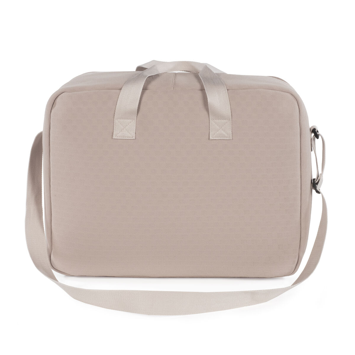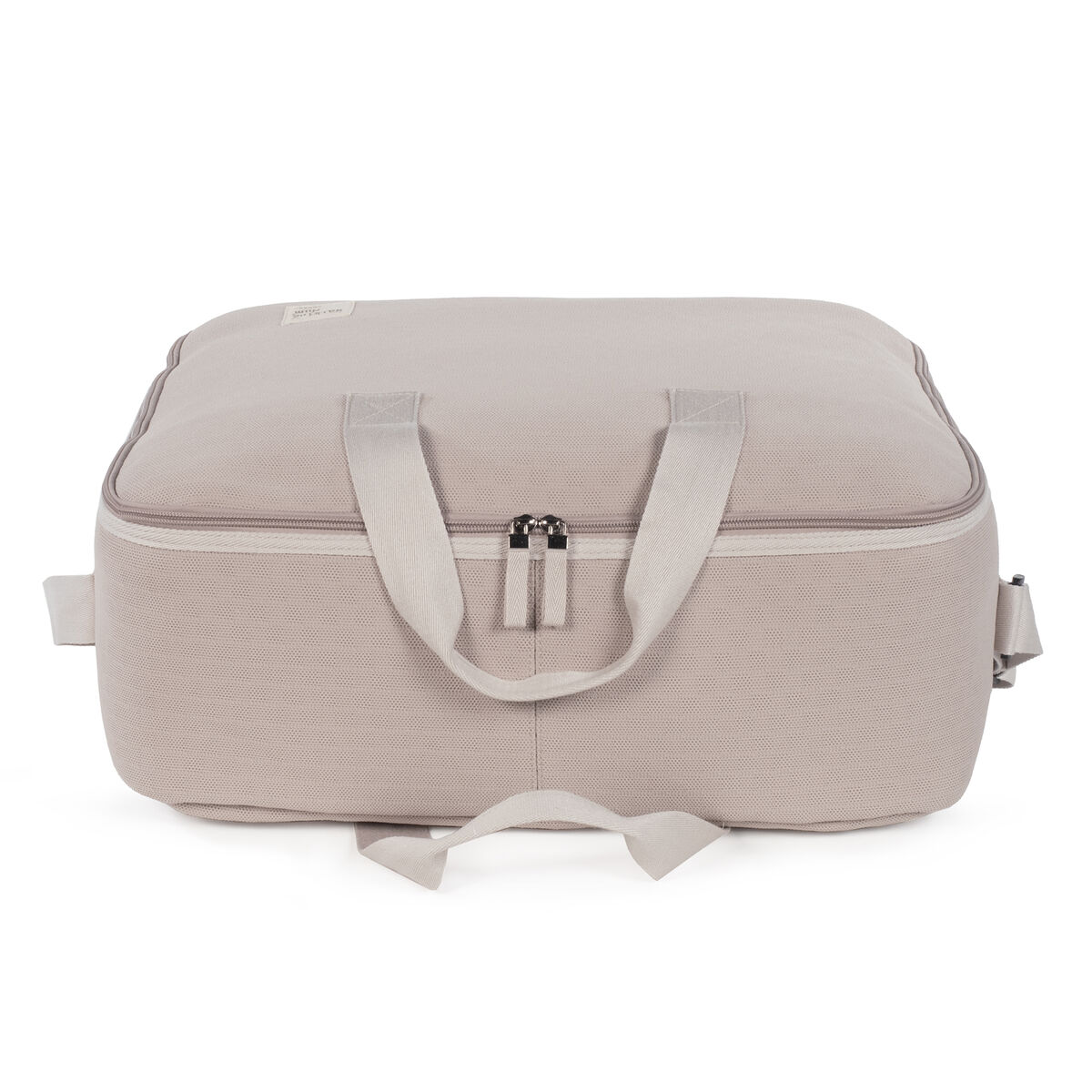 Modern, multifunkcionális bőrönd bézs színben, amiben minden elfér a kicsi érkezésére, és az első (vagy többedik) közös hosszabb útra.