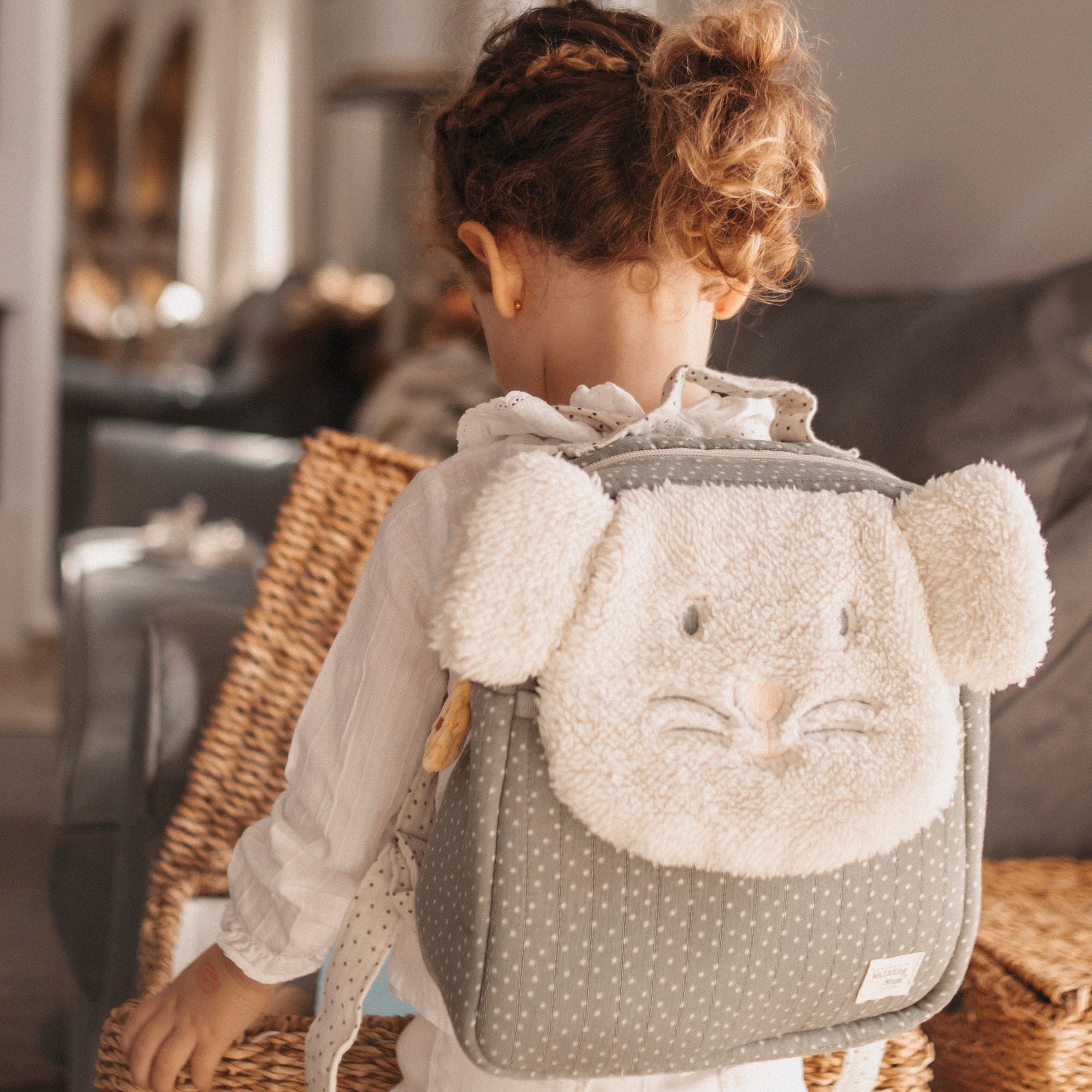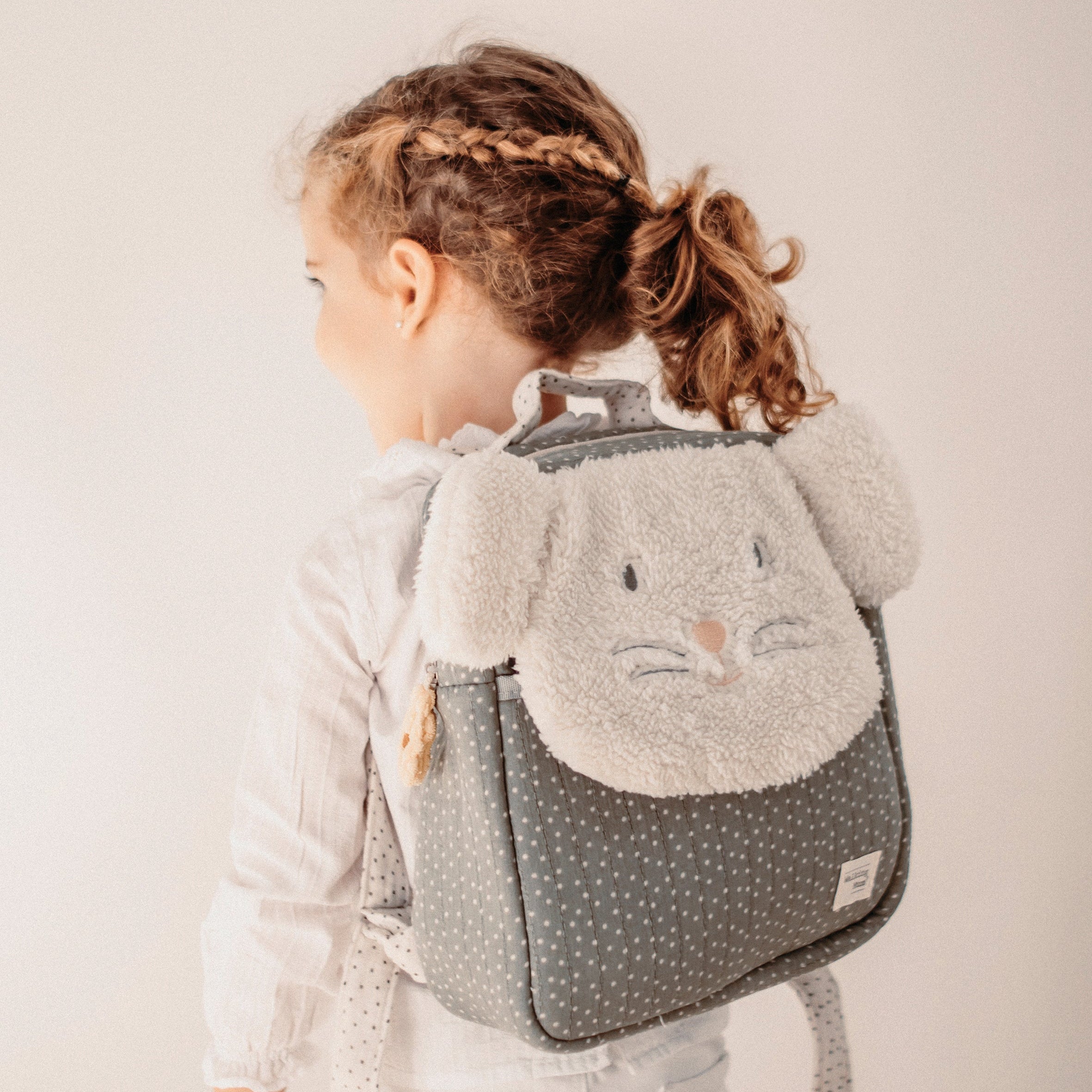 A pöttyös minta, az olíva árnyalat, valamint az aranyos egérfülek és hímzett részletek különleges, játékos karaktert adnak a hátizsáknak.