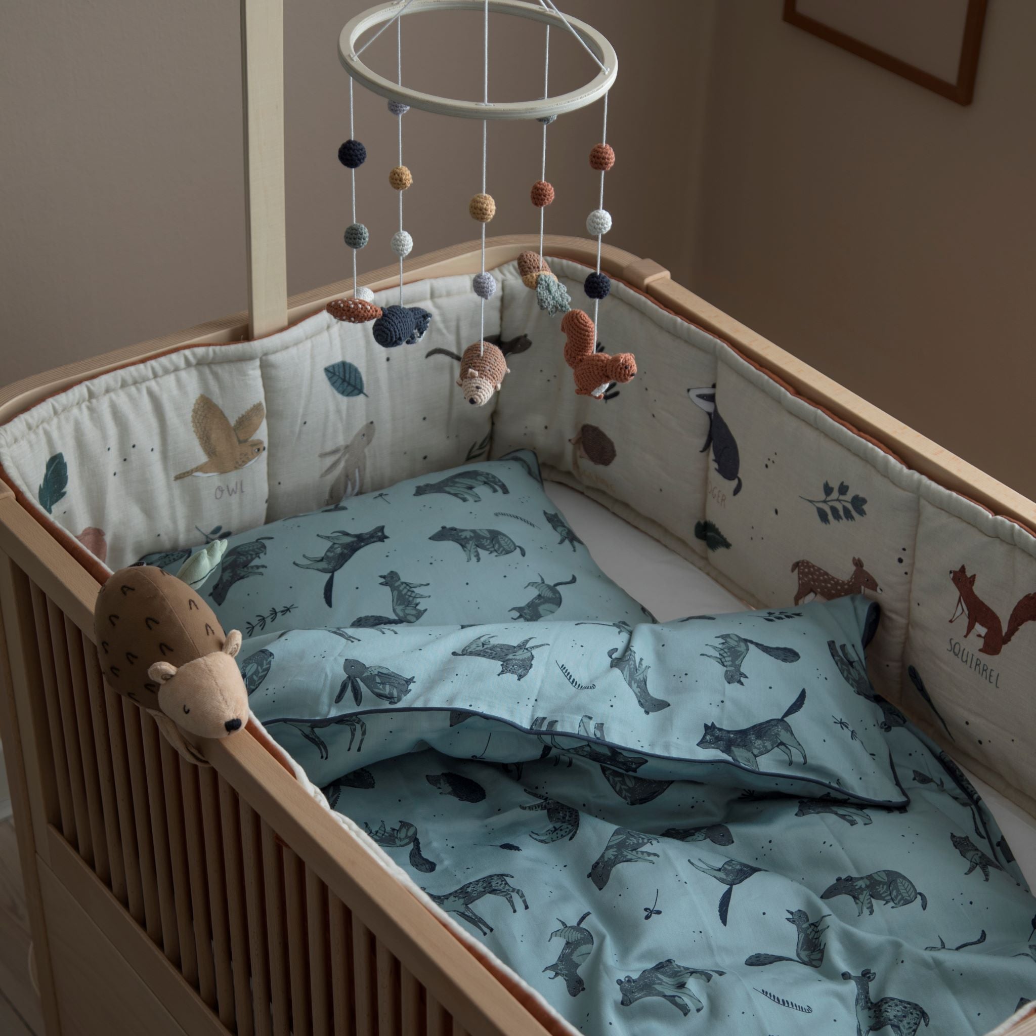 A környezettudatos gyerekszoba dekoráció kialakításának és megkötőinek köszönhetően bármely kiságyhoz könnyen illeszkedik. Az elengedhetetlen kiegészítőt, mely óvja a babát a kiságyban forgolódás, mozgolódás közben, fontos megfelelően rögzíteni a kiságyra - amennyiben az alső megkötőket nem használjátok, nyugodtan vágjátok le a varrás óvásával.