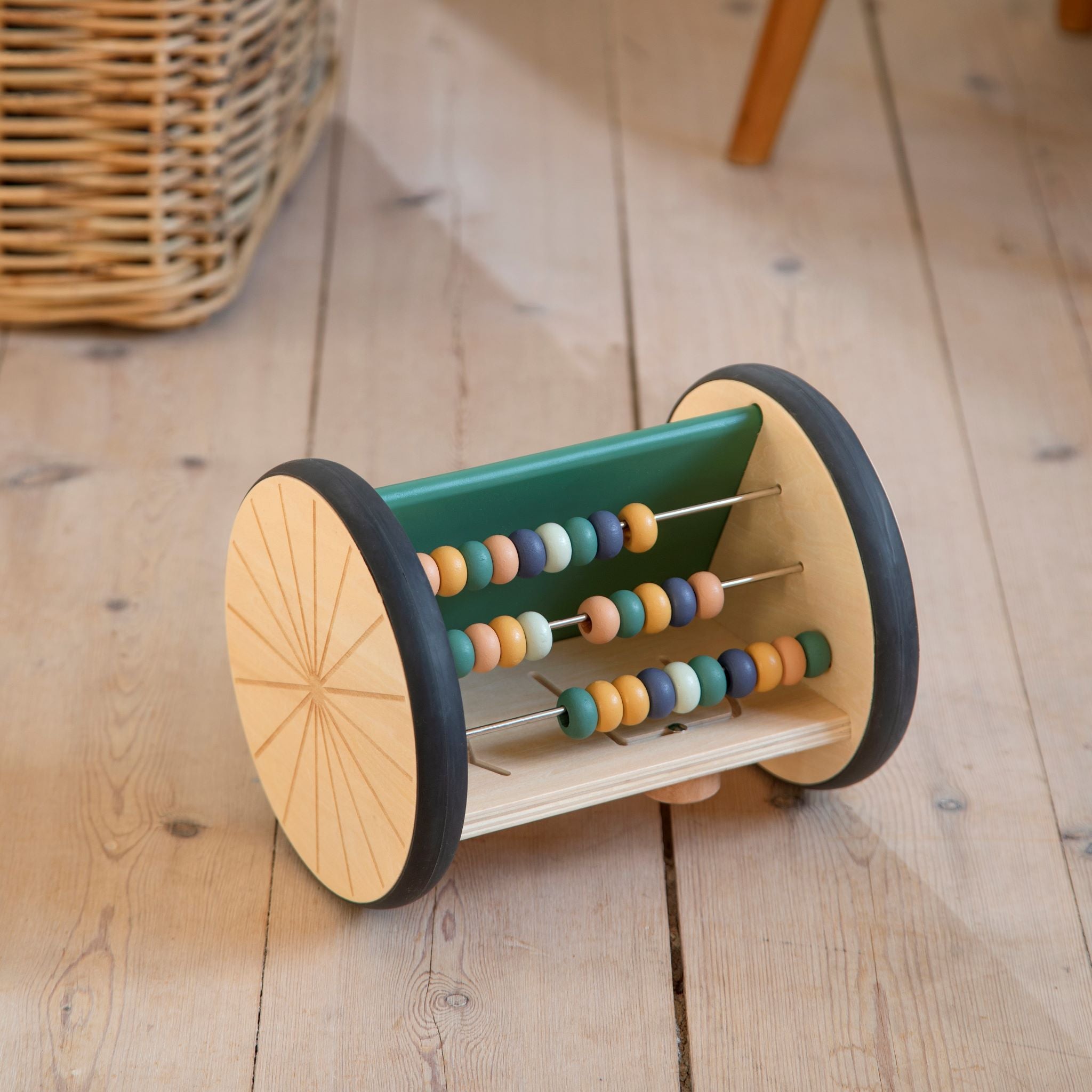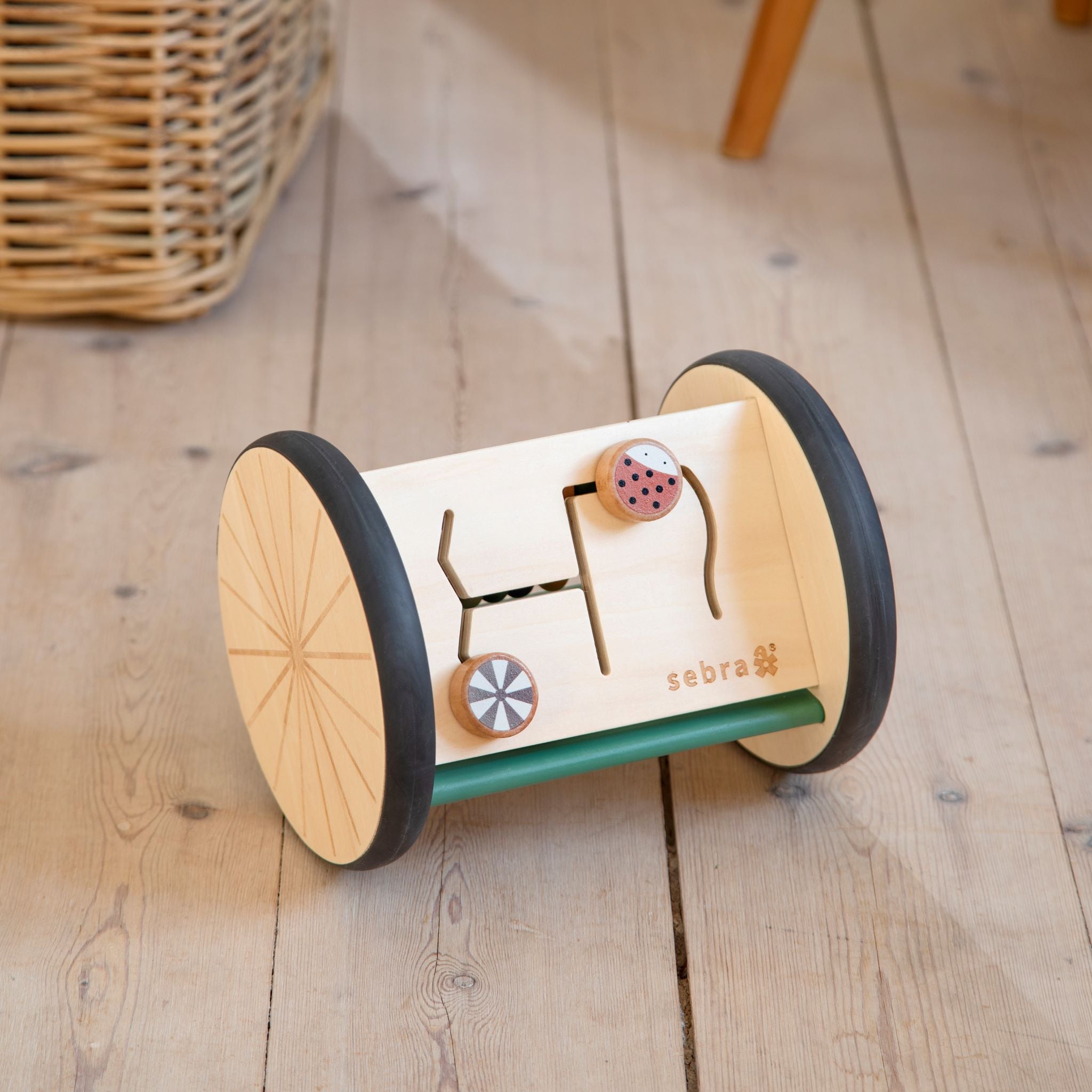 A fa készségfejlesztő görgő újszülött kortól támogatja a kicsit a kreatív és hasznos időtöltésben.