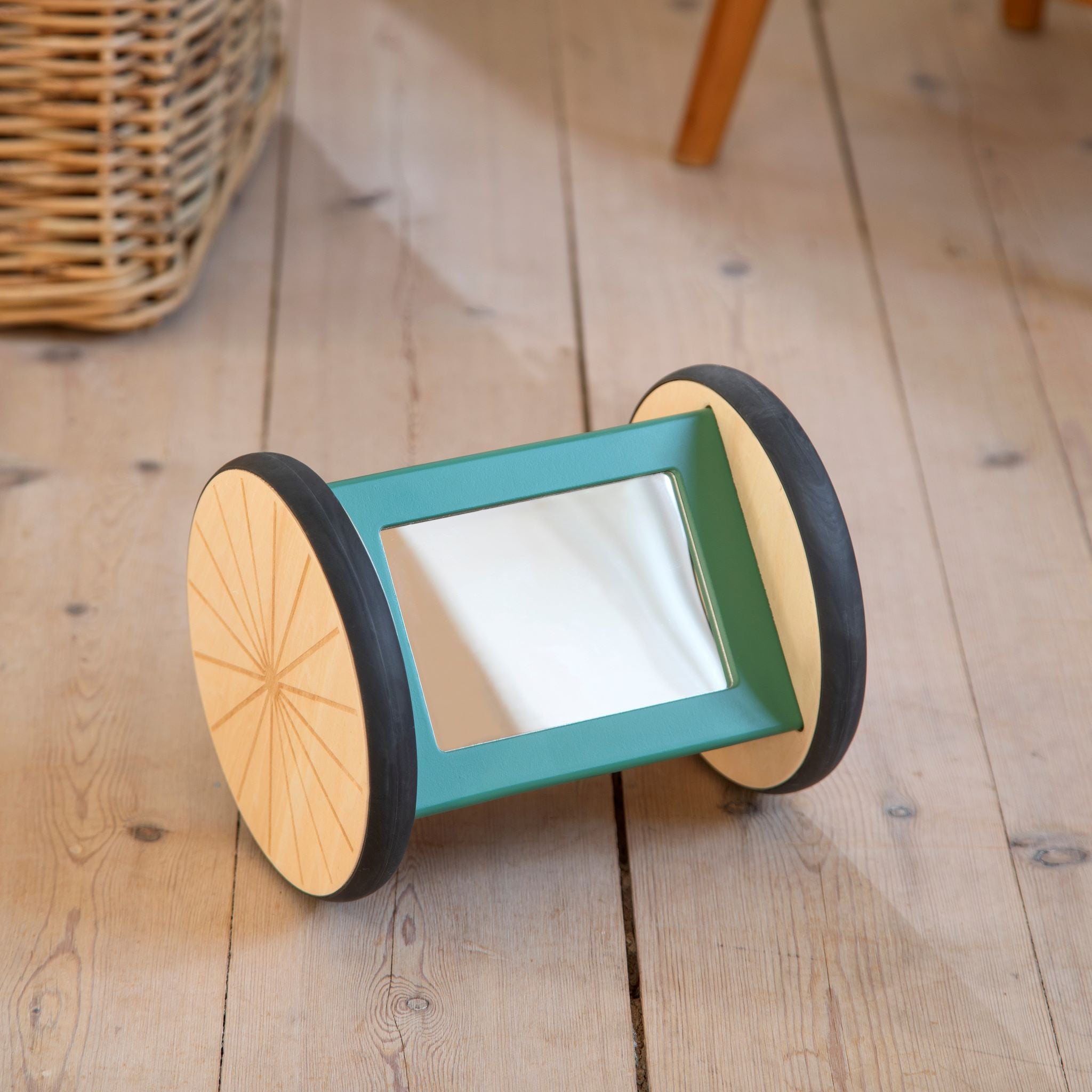 A kicsi hason fekve nézegetheti magát a babatükörben, amiben a mögötte és felette lévő környezetet is felfedezheti. A görgő másik oldalán színes "cukorkák" kötik le a figyelmét, amik elősegítik a finommotorikus készségek fejlődését. A görgő harmadik oldalán egy katica kér segítséget, hogy egyik pontból a másikba jusson.