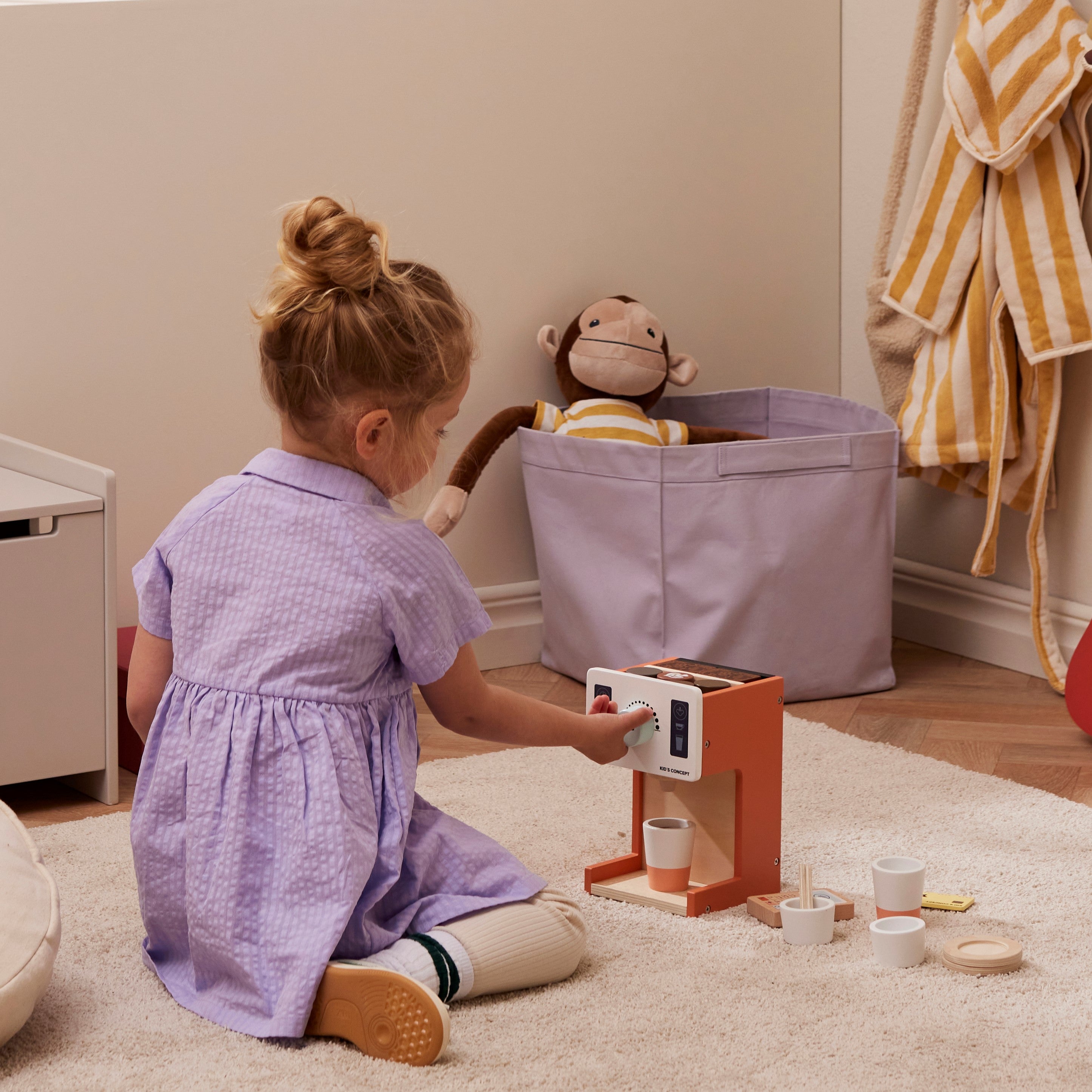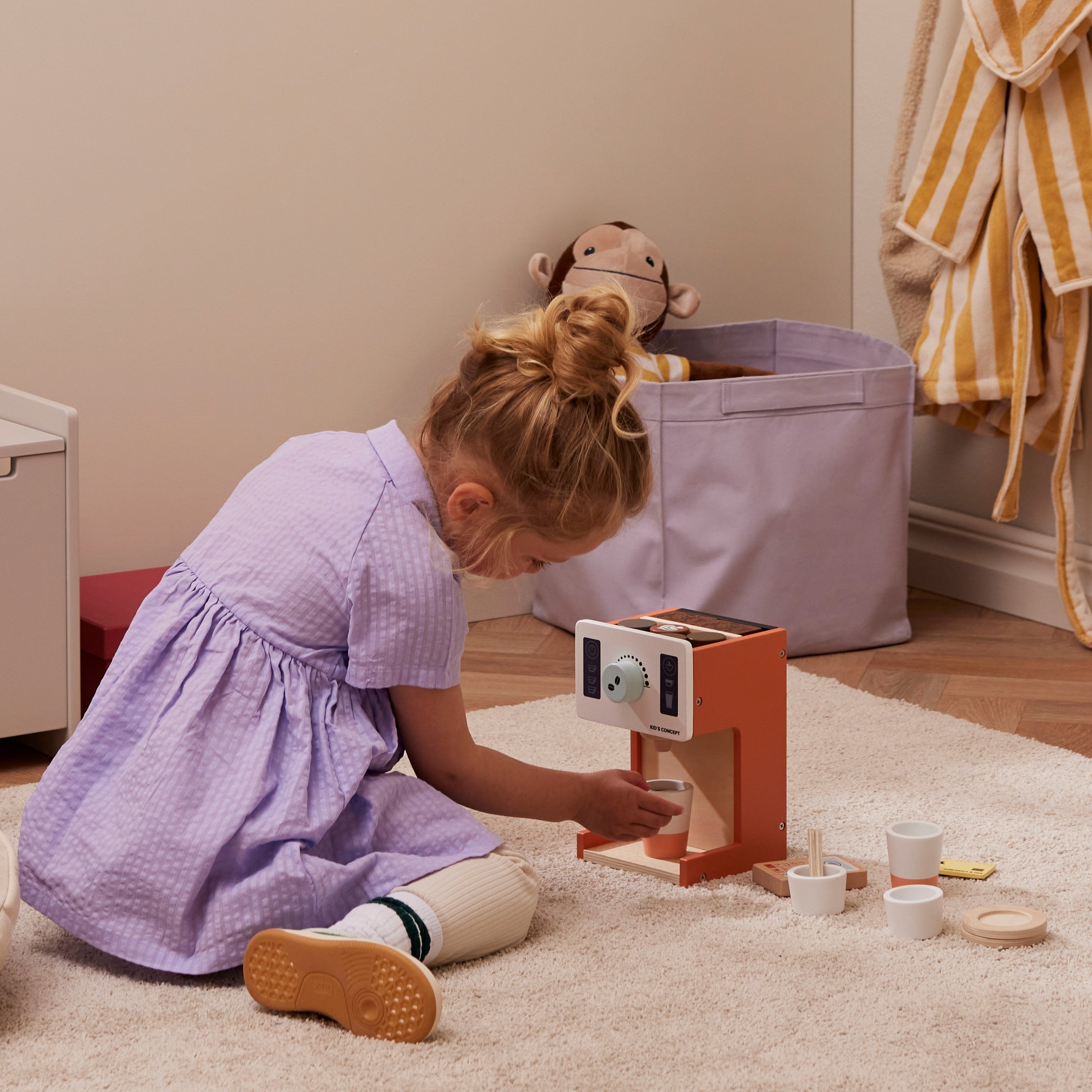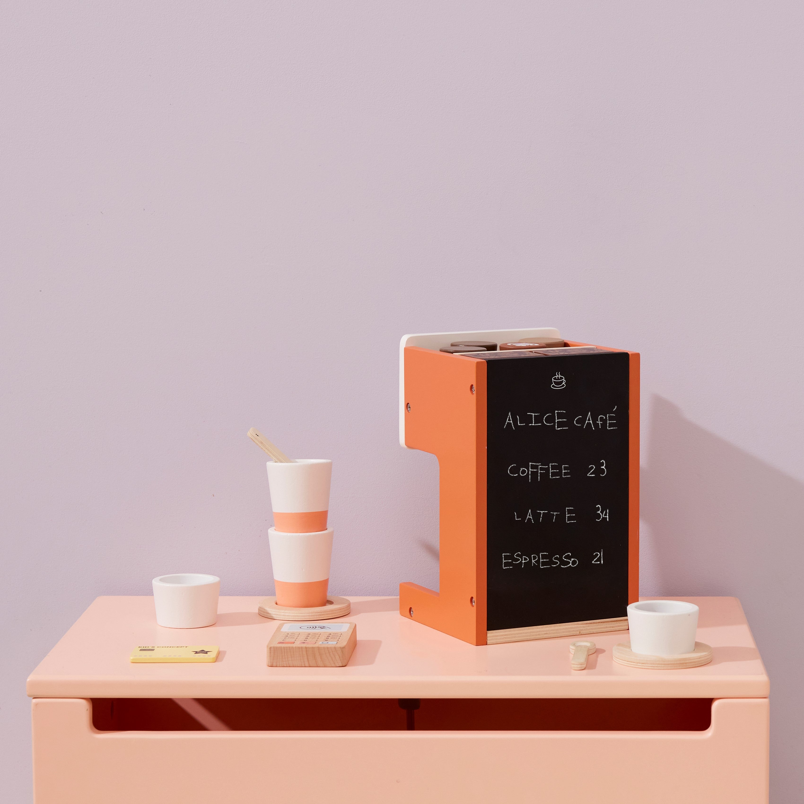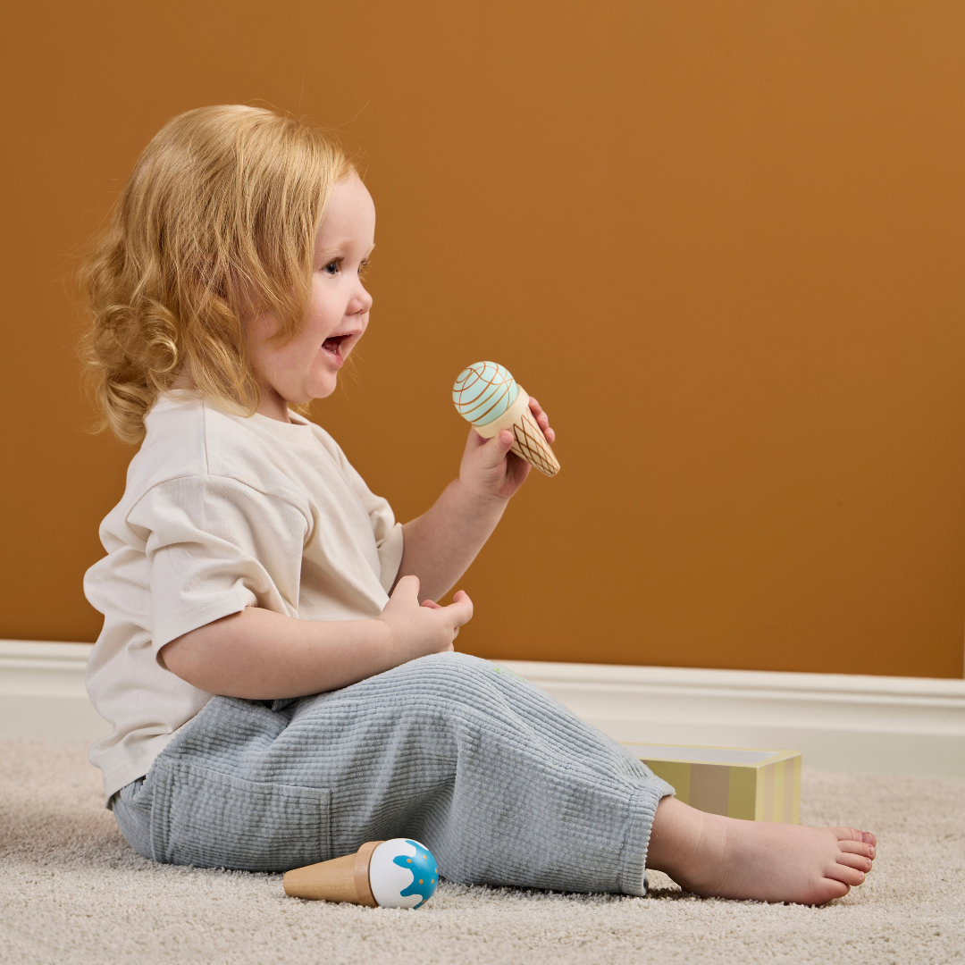 Az FSC-minősítésű fából készült fagylaltkészlet nemcsak tartós és környezetbarát, hanem könnyen rendben is tartható: az állvány egyszerre játékelem és tárolódoboz.