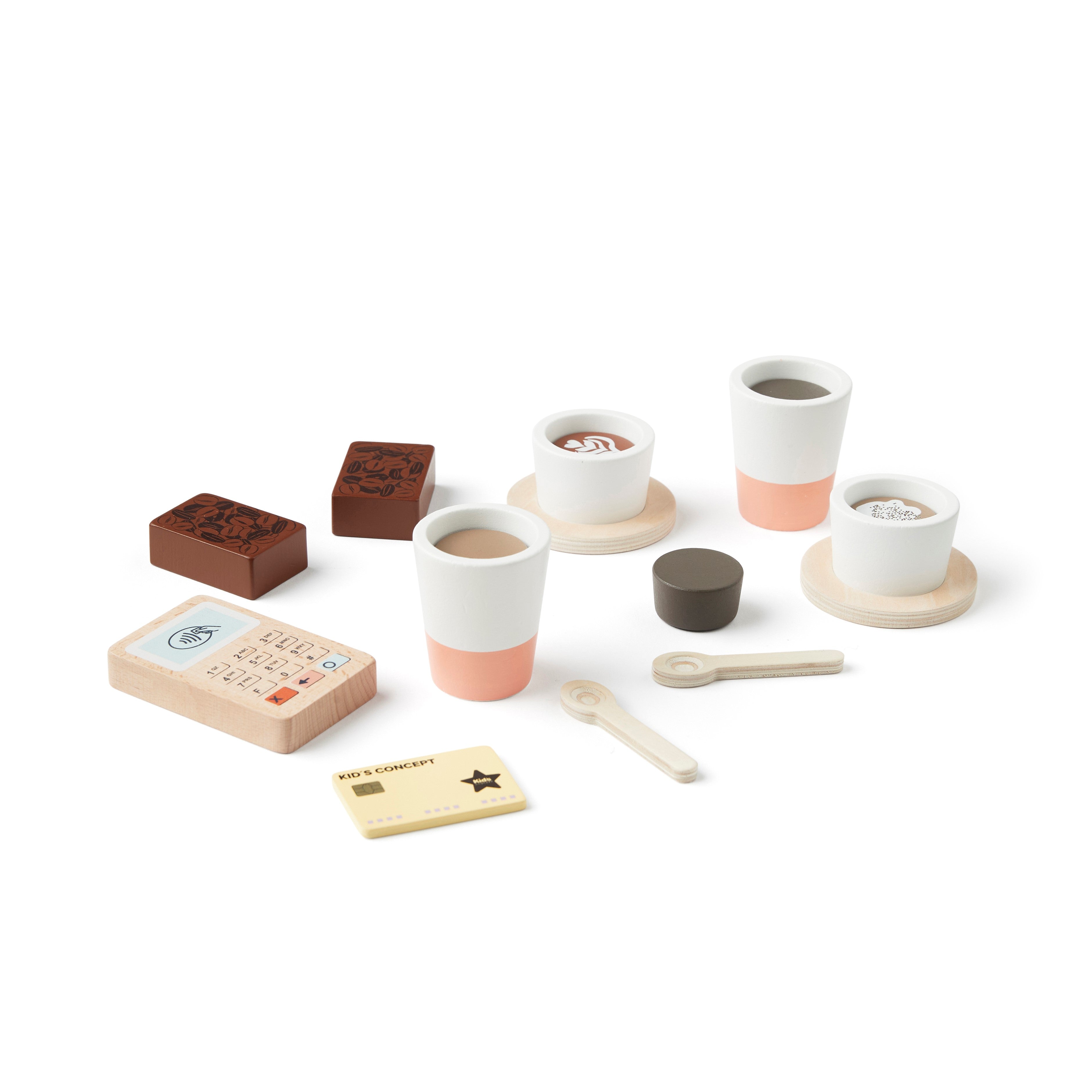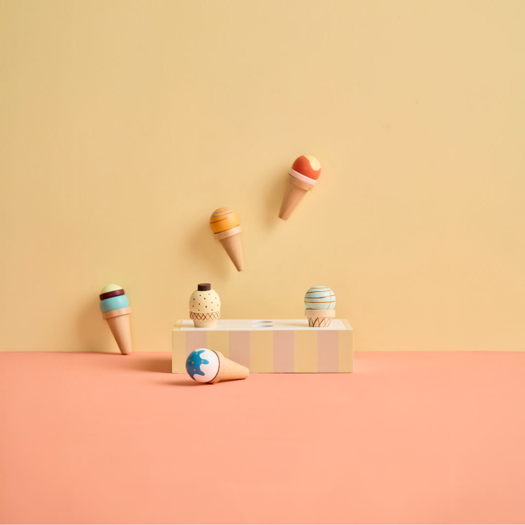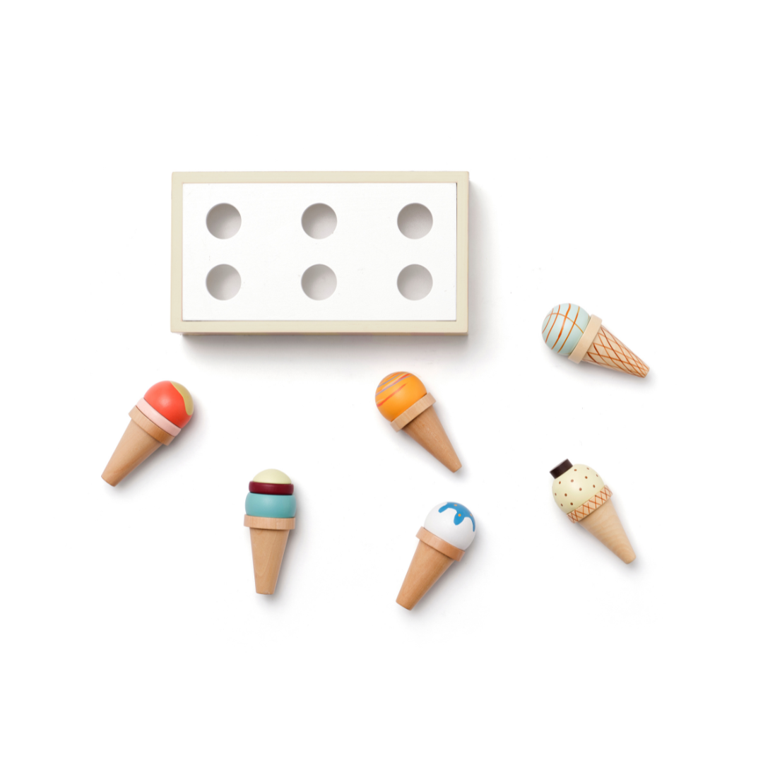 A Kid’s Concept fagylalt készlet hat darab fából készült fagylaltot és egy praktikus állványt tartalmaz, ahol mindegyik tölcsérnek megvan a helye.