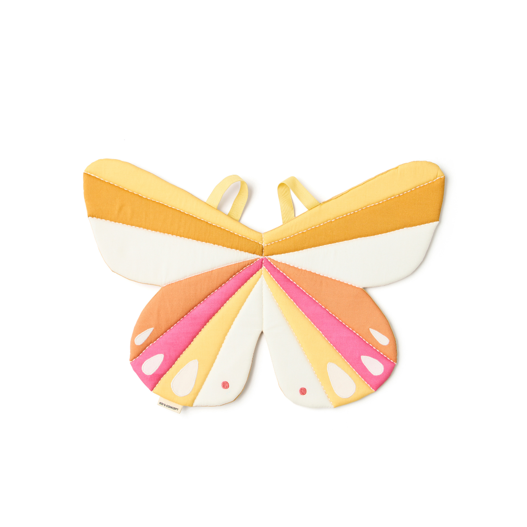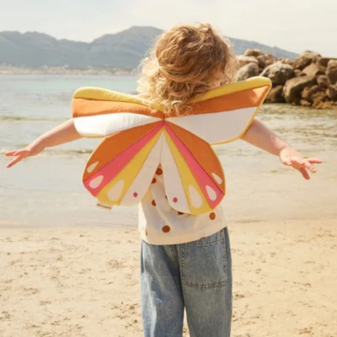 A pillangó szárny jelmez puha, párnázott kialakítása kényelmes viseletet biztosít, miközben szépen megtartja formáját. A hímzett részletek élethűvé és különlegessé teszik a megjelenést. Az elasztikus vállpántoknak köszönhetően a gyerekek önállóan is könnyedén fel- és levehetik a szárnyakat, támogatva az önálló játékot.