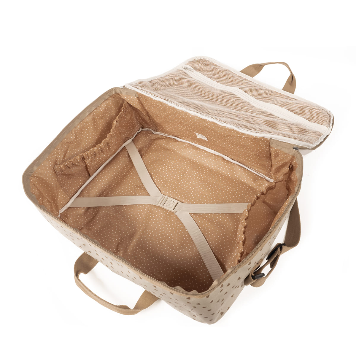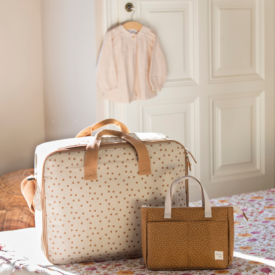 Modern, multifunkcionális bőrönd fahéj színű, szívecskés mintával, amiben minden elfér a kicsi érkezésére, és az első (vagy többedik) közös hosszabb útra.