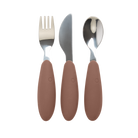 A BIBS evőeszköz készlet egy villát, egy kést és egy ergonomikus kialakítású kanalat tartalmaz. Támogatja az önálló étkezést csúszásmentes szilikon fogantyúkkal.