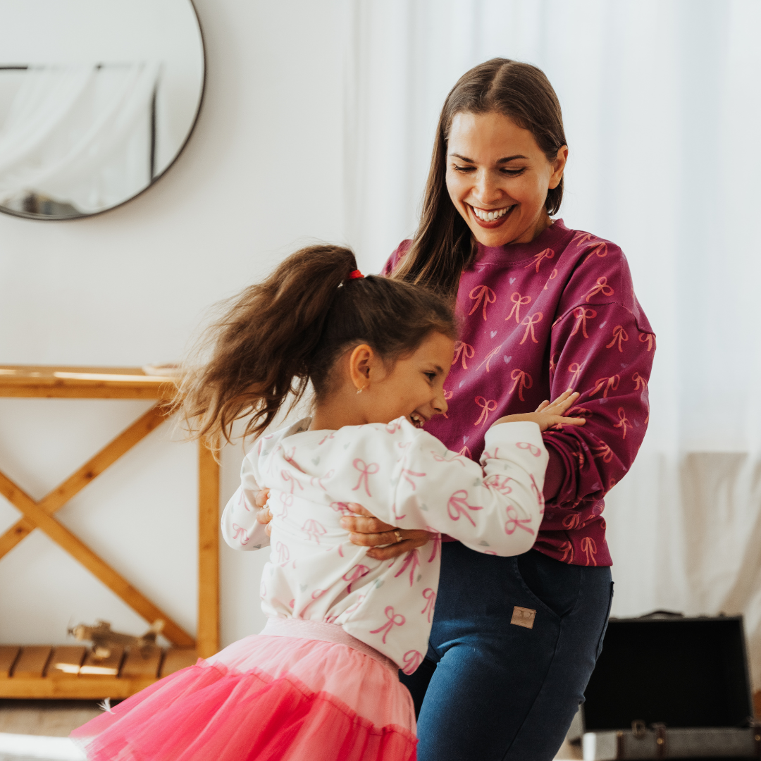A fukszia alapon masni és szívecske mintás pulóver örök kedvenc.