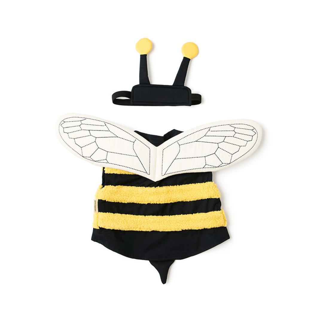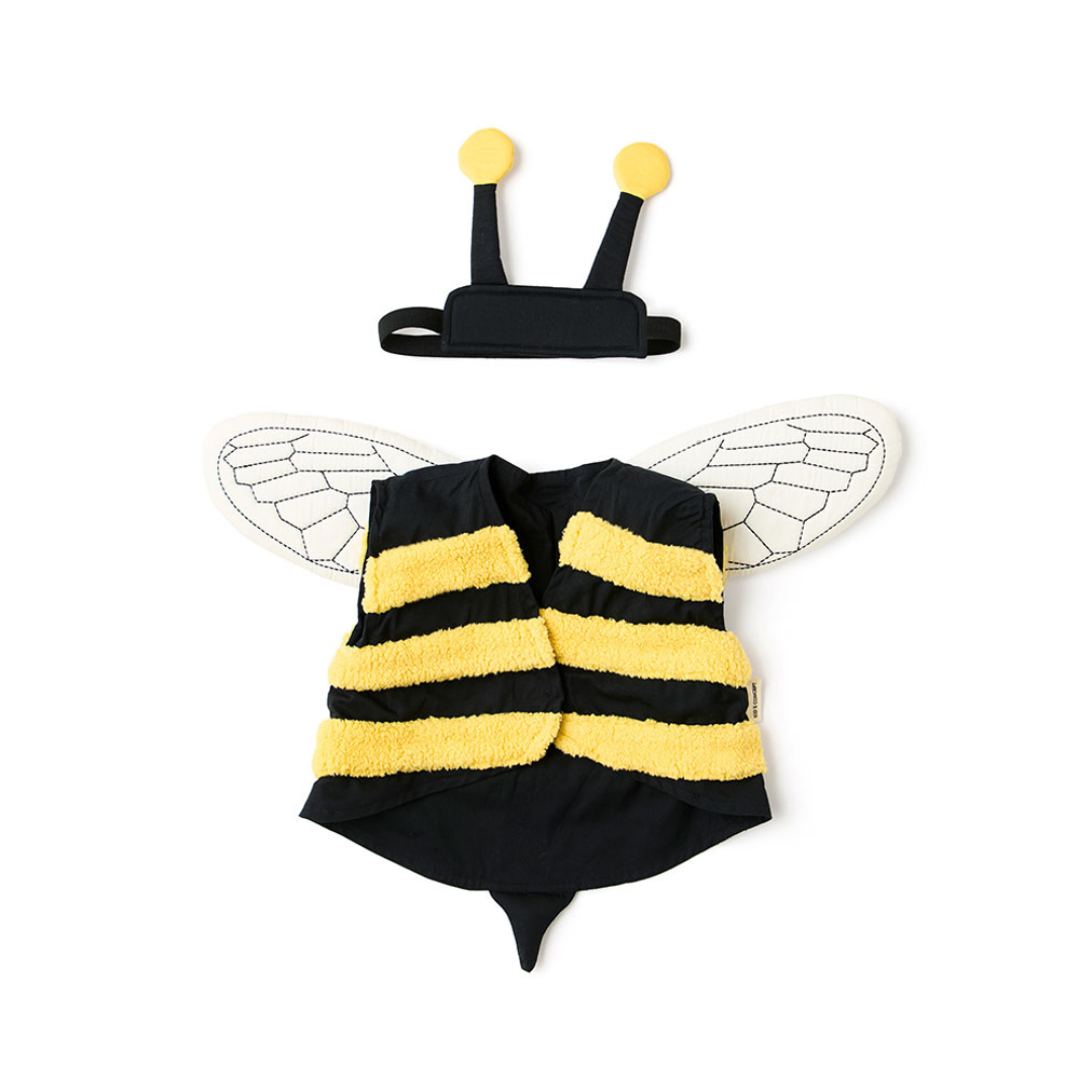 A sárga-fekete csíkos mellény puha, bolyhos anyagból készült, ami a valódi méhecskék pihés megjelenését idézi. A tépőzáras kialakításnak köszönhetően könnyen fel- és levehető. A hímzett fekete szárnyak és a párnázott, antennás fejpánt teljessé teszi a méhecske megjelenést, egyszerre kényelmes és látványos.