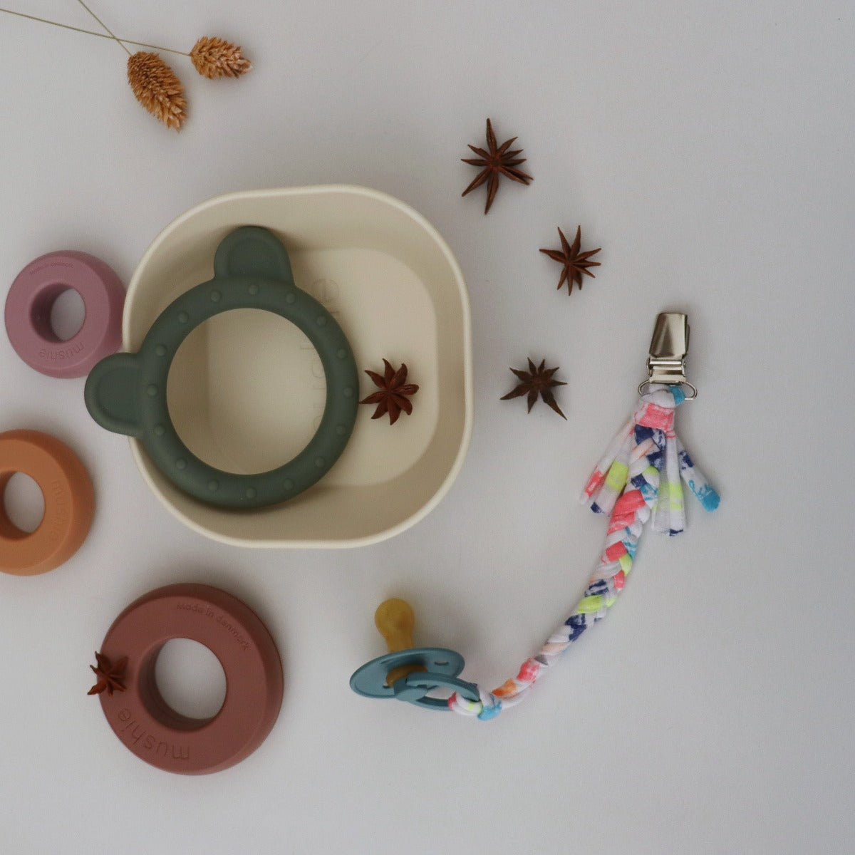 A Mushie az amerikai anyukák kedvenc márkája. Célja, hogy nyugalmat és harmóniát hozzon a kisgyermekes családok mindennapjaiba minőségi termékeivel.